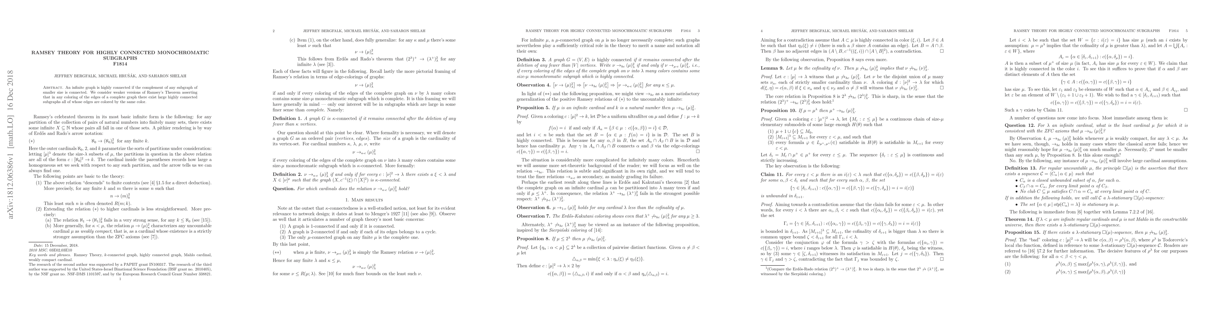 An infinite graph is highly connected if the complement of any subgraph of smaller size is connected. We consider weaker versions of Ramsey's Theorem asserting that in any coloring of the edges of a complete graph there exist large highly connected subgraphs all of whose edges are colored by the same color.