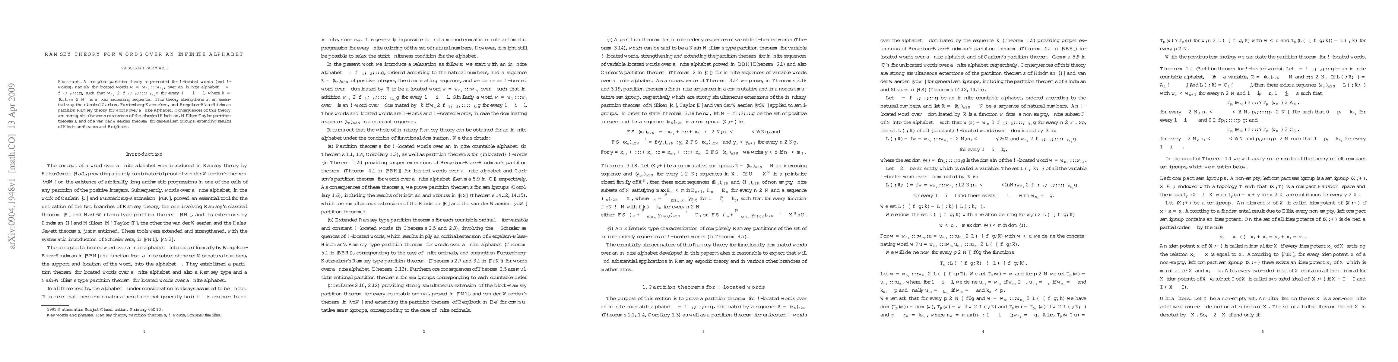 A complete partition theory is presented for omega-located words (and omega-words), namely for located words over an infinite alphabet dominated by a fixed increasing sequence. This theory strengthens in an essential way the classical Carlson, Furstenberg-Katznelson, and Bergelson-Blass-Hindman partition theory for words over a finite alphabet. Consequences of this theory are strong simultaneous extensions of the classical Hindman, Milliken-Taylor partition theorem, and of a van der Waerden theorem for general semigroups, extending results of Hindman-Strauss and Beiglbock.