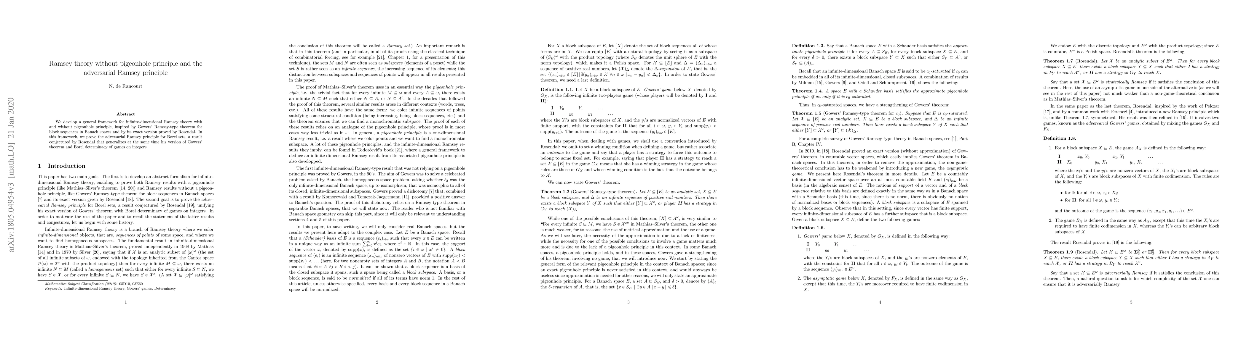 This paper establishes a framework for infinite-dimensional Ramsey theory, exploring scenarios without the pigeonhole principle and proving the adversarial Ramsey principle for Borel sets, which extends Gowers' theorem and Borel determinacy.