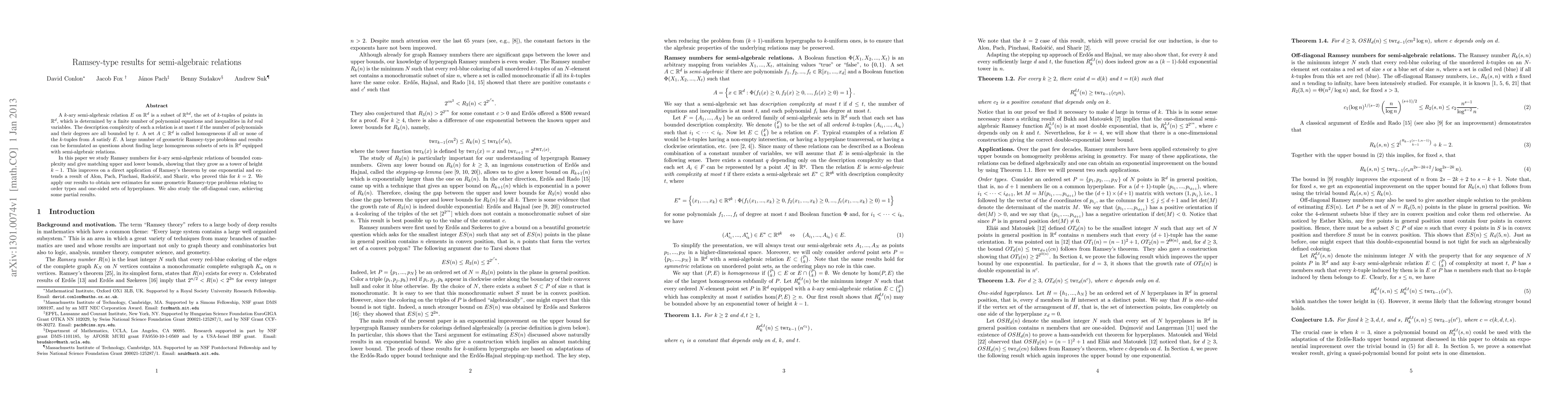 The paper studies Ramsey-type results for k-ary semi-algebraic relations with bounded complexity, establishing a new tower of height k-1 and improving previous estimates for geometric Ramsey-type problems.