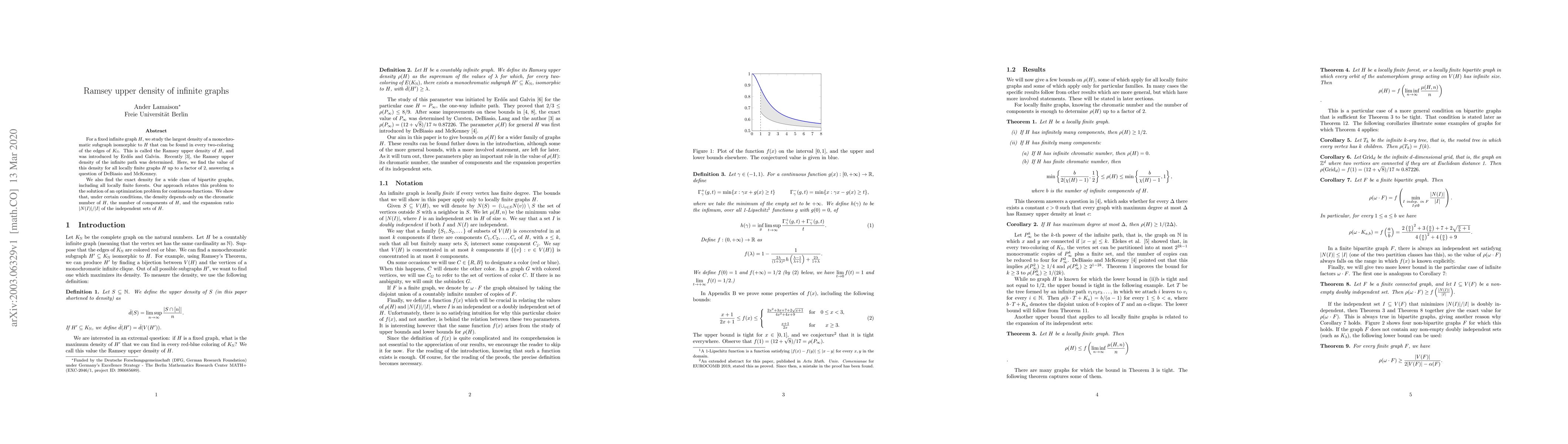 The paper calculates the Ramsey upper density of infinite graphs, determining the largest density of a monochromatic subgraph isomorphic to H that can be found in every two-coloring of the edges of Kn. It also shows how the density depends on the chromatic number and expansion ratio of H.
