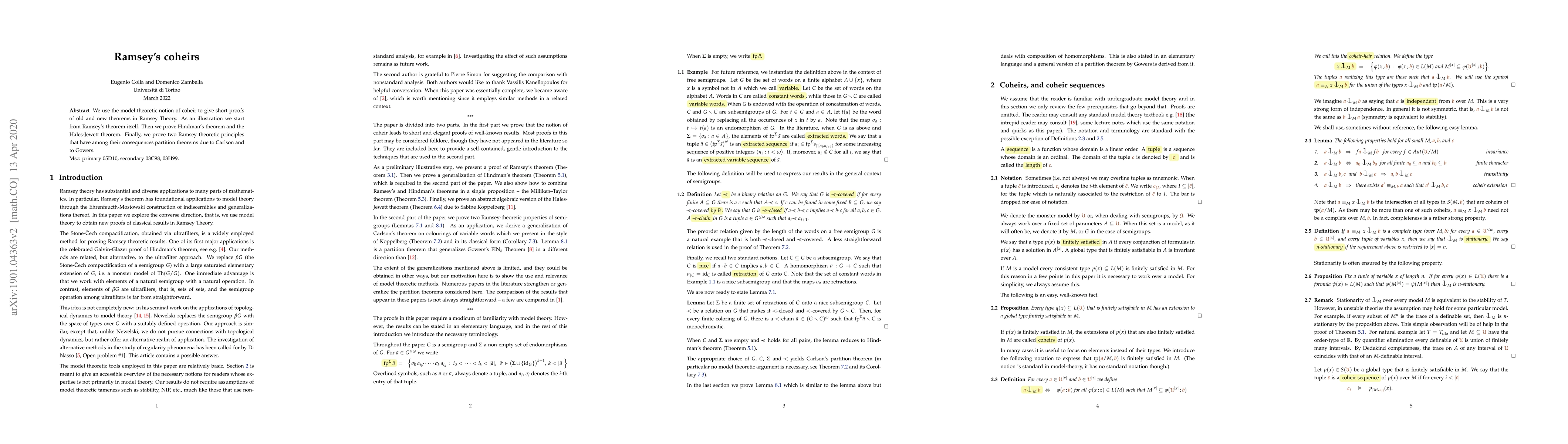 We use the model theoretic notion of coheir to give short proofs of old and new theorems in Ramsey Theory. As an illustration we start from Ramsey's theorem itself. Then we prove Hindman's theorem and the Hales-Jewett theorem. Finally, we prove two Ramsey theoretic principles that have among their consequences partition theorems of Carlson and of Gowers.