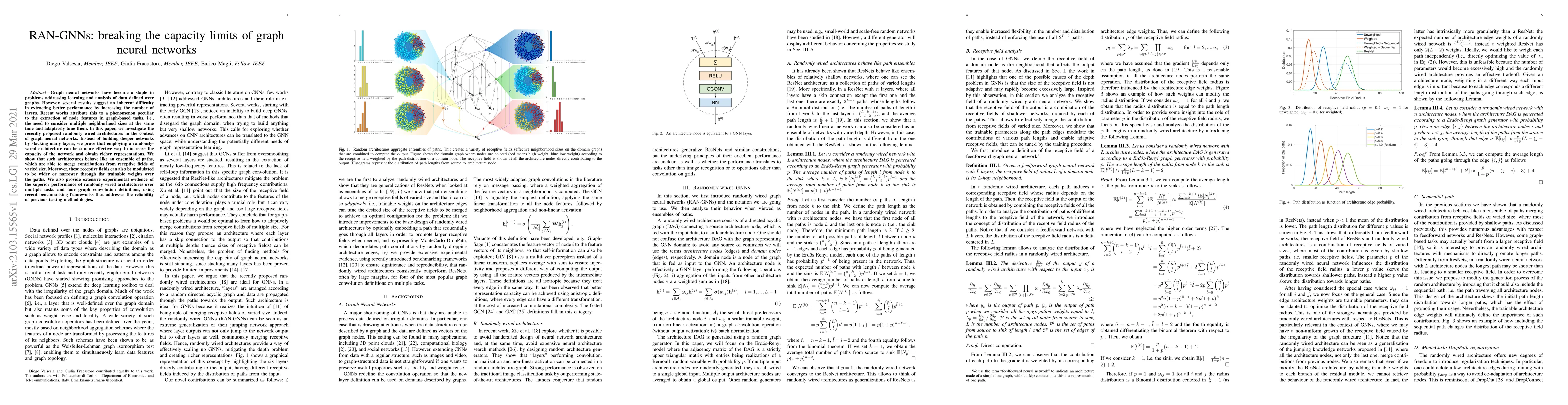 Graph neural networks have become a staple in problems addressing learning and analysis of data defined over graphs. However, several results suggest an inherent difficulty in extracting better performance by increasing the number of layers. Recent works attribute this to a phenomenon peculiar to the extraction of node features in graph-based tasks, i.e., the need to consider multiple neighborhood sizes at the same time and adaptively tune them. In this paper, we investigate the recently proposed randomly wired architectures in the context of graph neural networks. Instead of building deeper networks by stacking many layers, we prove that employing a randomly-wired architecture can be a more effective way to increase the capacity of the network and obtain richer representations. We show that such architectures behave like an ensemble of paths, which are able to merge contributions from receptive fields of varied size. Moreover, these receptive fields can also be modulated to be wider or narrower through the trainable weights over the paths. We also provide extensive experimental evidence of the superior performance of randomly wired architectures over multiple tasks and four graph convolution definitions, using recent benchmarking frameworks that addresses the reliability of previous testing methodologies.