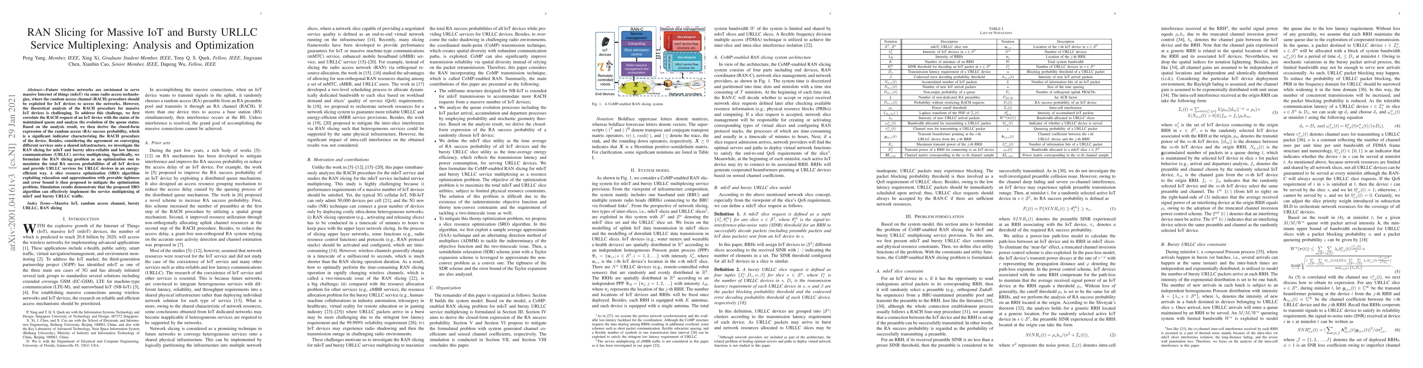 This paper analyzes the random access channel (RACH) procedure for massive IoT devices and derives a closed-form expression for the random access success probability. It also formulates the RAN slicing problem to optimize the multiplexing of IoT and ultra-reliable low-latency communication (URLLC) services, proposing an energy-efficient slice resource optimization algorithm with proven performance.