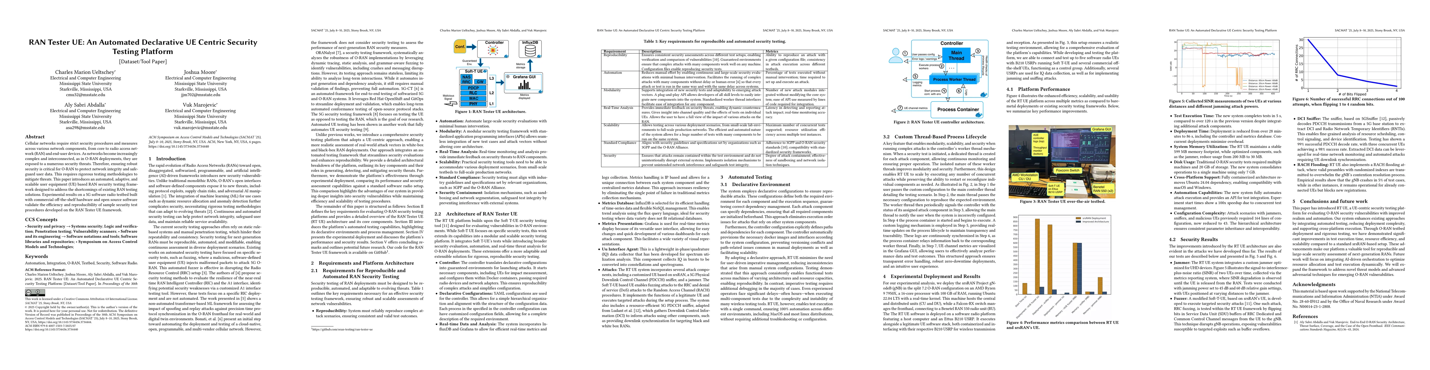 The paper introduces an automated, adaptive, and scalable user equipment (UE) based RAN security testing framework called RAN Tester UE.