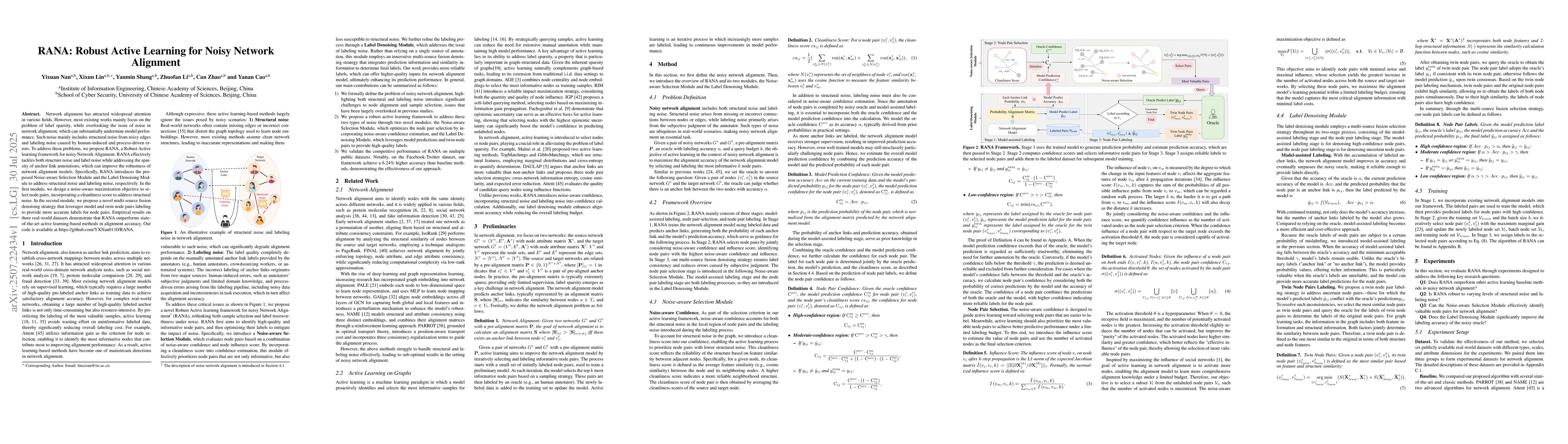 This research is significant as it addresses the issue of noisy network alignment, which is prevalent in various fields but often overlooked. By proposing RANA, a robust active learning framework, it aims to improve the performance and reliability of network alignment models in noisy environments, thereby enhancing their applicability across different domains.