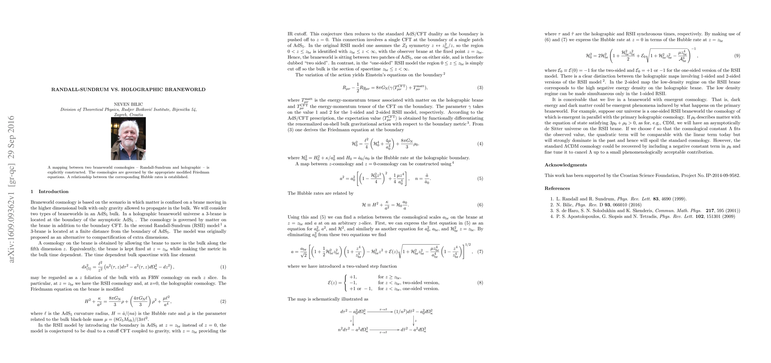 The paper presents a novel method for connecting Randall-Sundrum and holographic braneworld cosmologies through modified Friedman equations, providing a relationship between their Hubble rates.