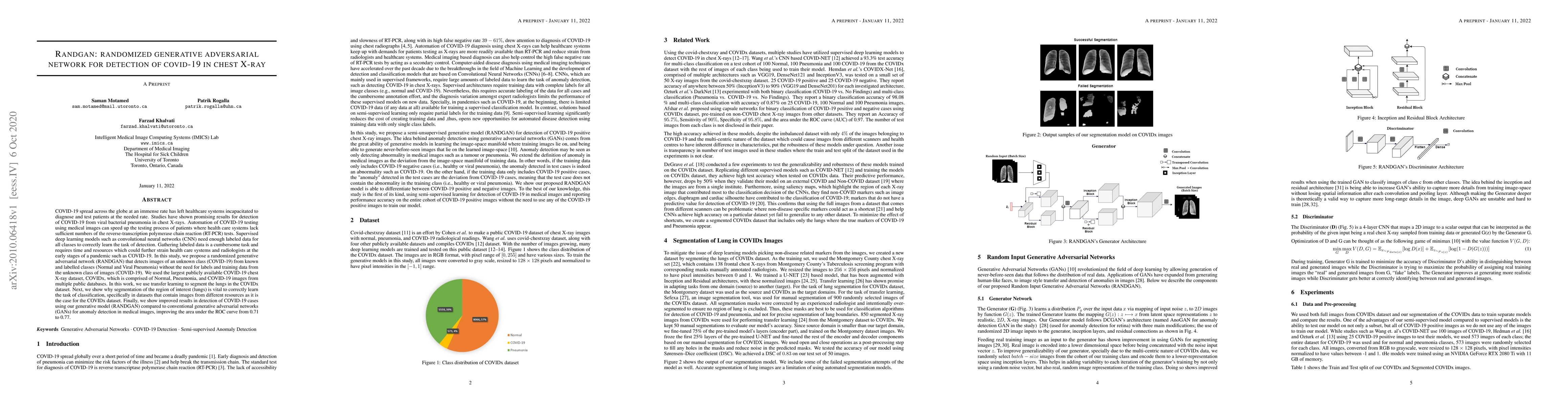 This paper proposes a randomized generative adversarial network (RANDGAN) for detecting COVID-19 in chest X-rays without requiring labeled COVID-19 data. The method uses transfer learning to segment lung regions and shows improved detection performance compared to conventional GANs, enhancing the area under the ROC curve from 0.71 to 0.77.