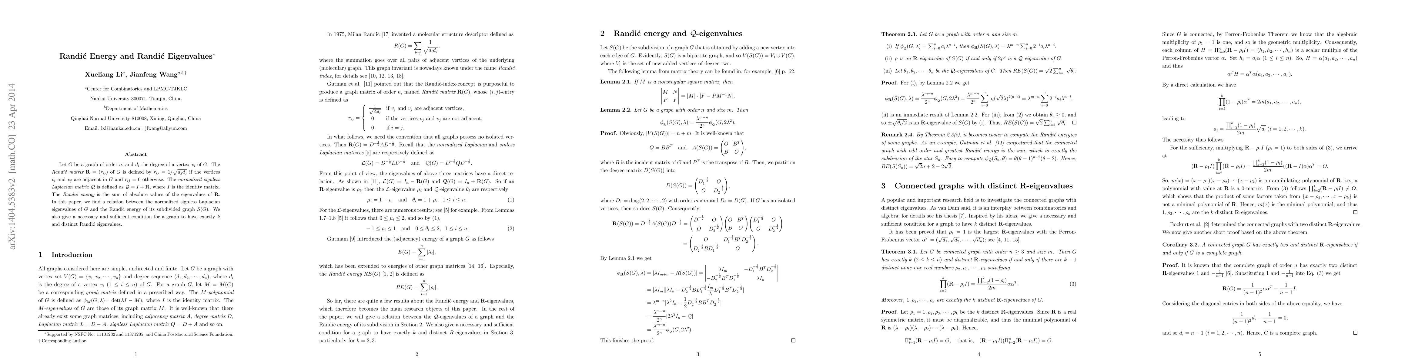 The paper explores the relationship between the normalized signless Laplacian eigenvalues of a graph G and the Randić energy of its subdivided graph S(G). It also provides a necessary and sufficient condition for a graph to have exactly k distinct Randić eigenvalues.