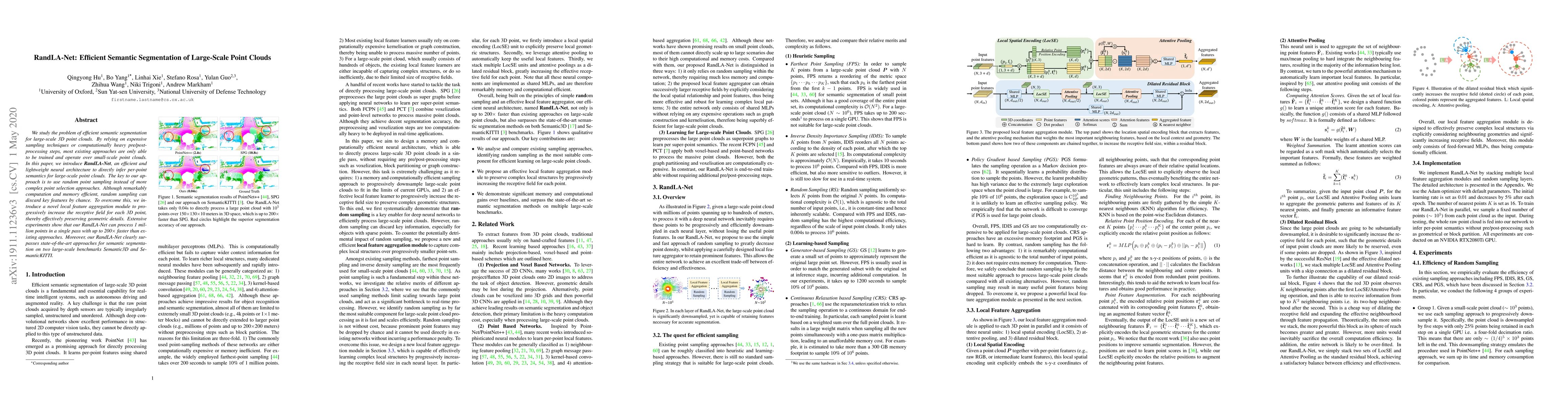 RandLA-Net introduces an efficient neural architecture for semantic segmentation of large-scale 3D point clouds by employing random point sampling and a local feature aggregation module to preserve geometric details, achieving up to 200X faster processing compared to existing methods. The approach outperforms state-of-the-art on Semantic3D and SemanticKITTI benchmarks.