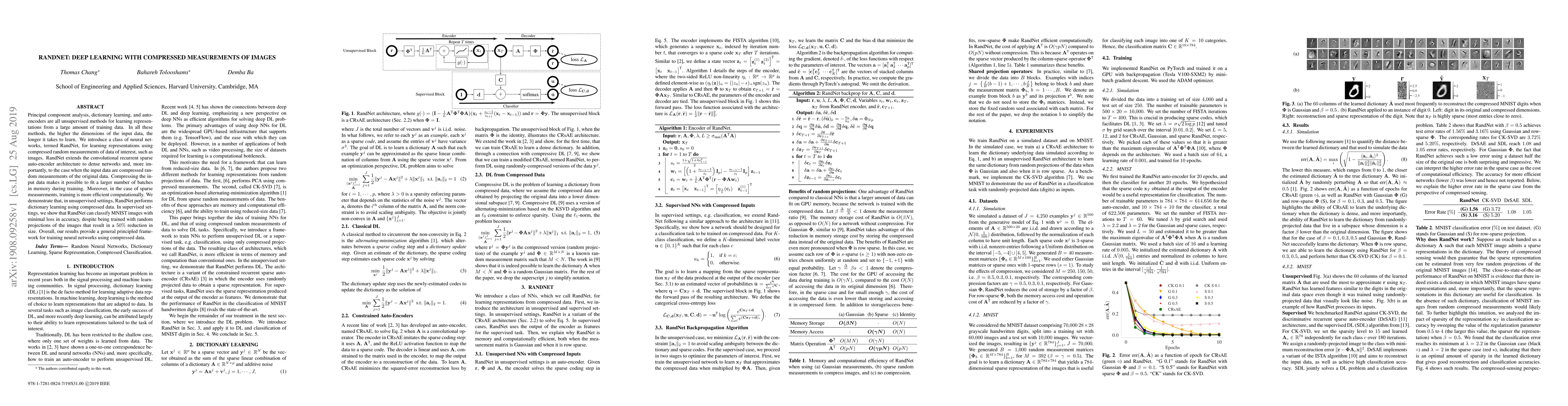 RandNet introduces neural networks for learning representations from compressed random measurements of images, enabling faster training with larger batch sizes and computational efficiency. It demonstrates effective unsupervised dictionary learning and maintains accuracy in supervised classification tasks, such as MNIST, despite significant data compression.