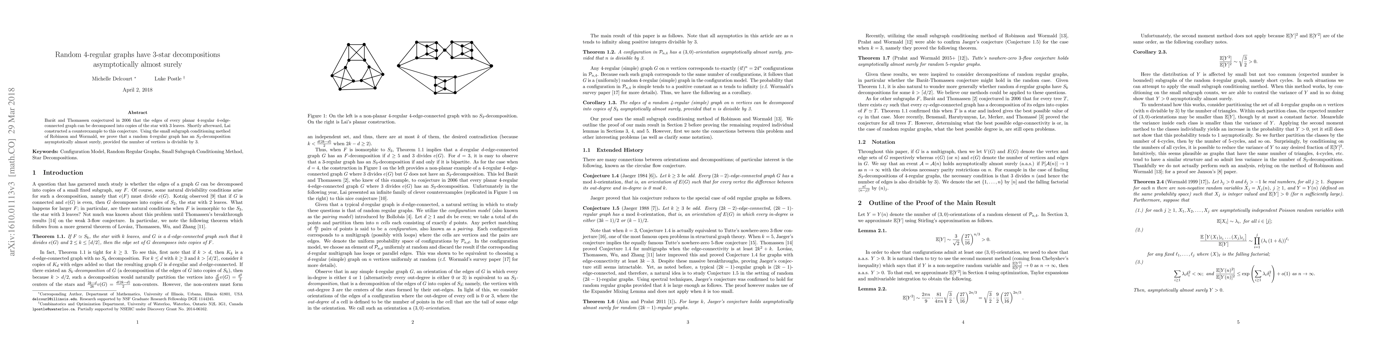 Summary: This paper proves that random 4-regular graphs, where the number of vertices is divisible by 3, have 3-star decompositions almost surely, refuting a previous conjecture and utilizing the small subgraph conditioning method.