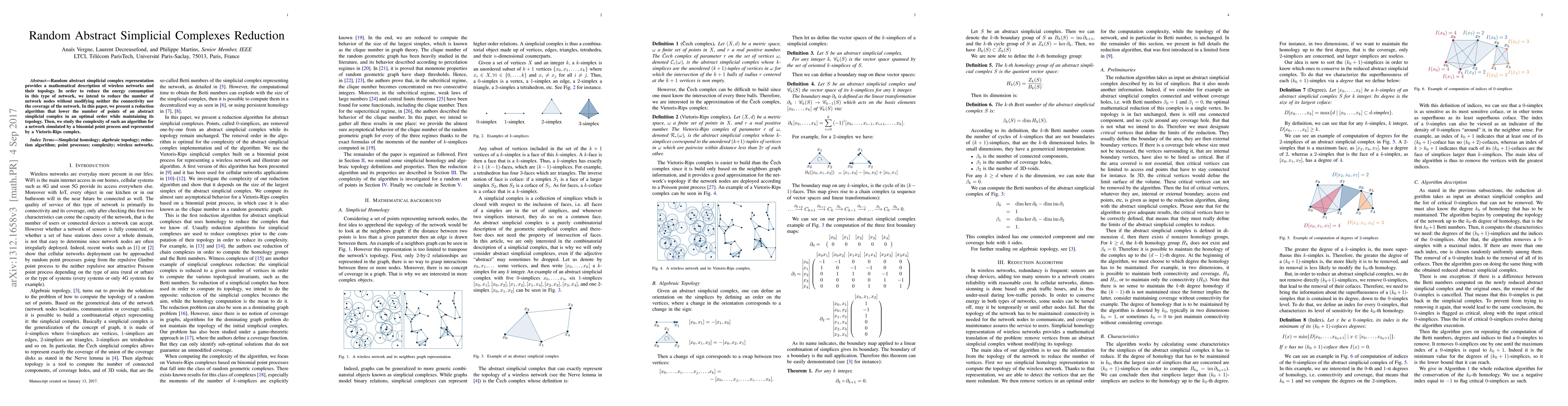 This paper proposes an algorithm to reduce the number of nodes in random abstract simplicial complexes representing wireless networks, aiming to minimize energy consumption without altering connectivity or coverage. The algorithm optimally reduces nodes while maintaining network topology, and its complexity is analyzed for networks modeled by a binomial point process.
