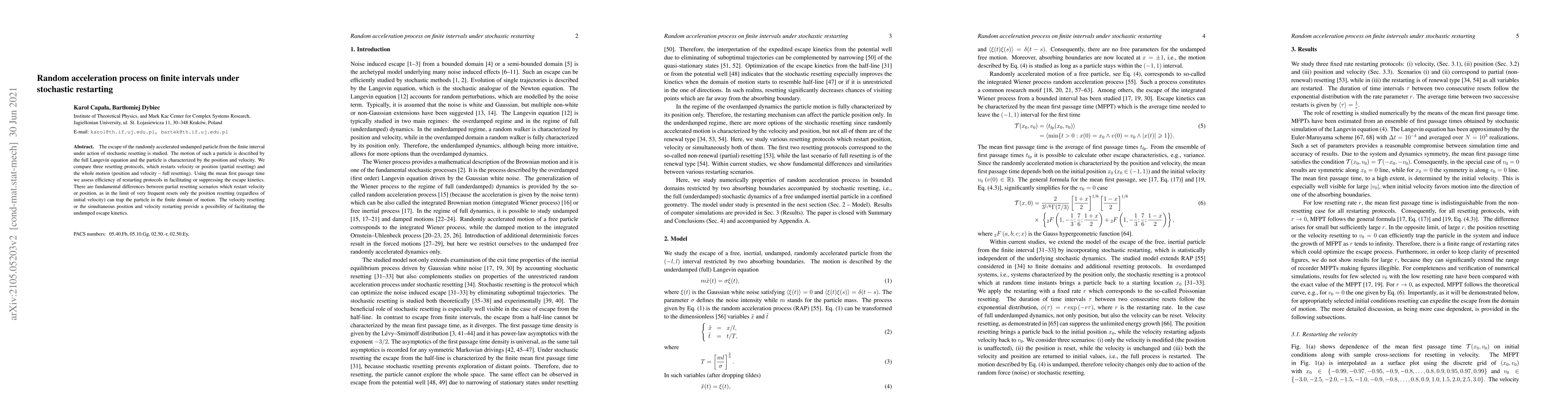 A study examines how random acceleration of a particle affects its escape from a finite interval when subject to different restarting protocols, finding that position resetting can trap particles while velocity or simultaneous resetting facilitates escape.