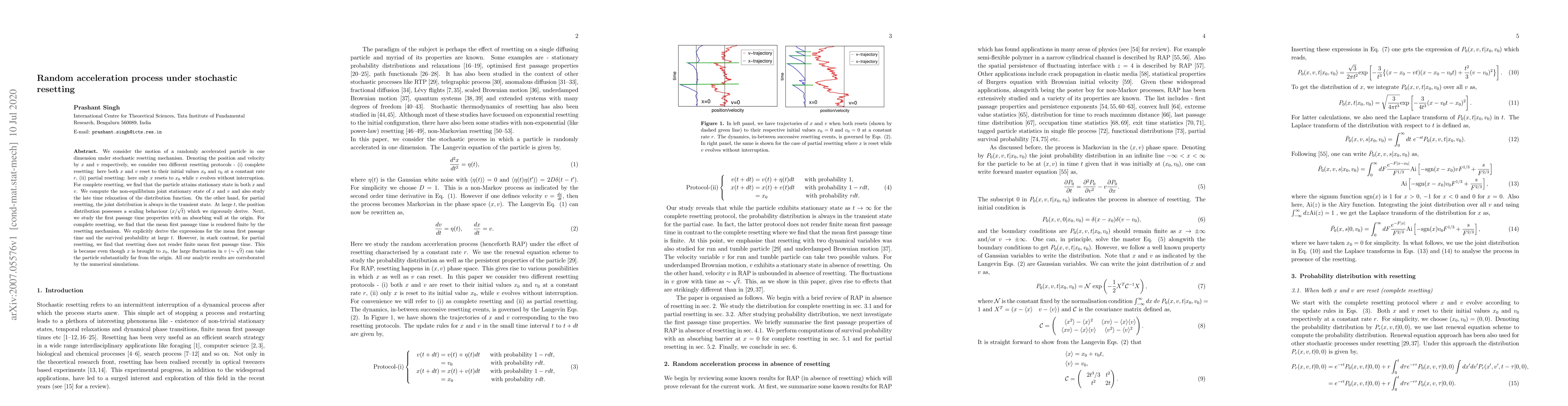 We consider the motion of a randomly accelerated particle in one dimension under stochastic resetting mechanism. Denoting the position and velocity by $x$ and $v$ respectively, we consider two different resetting protocols - (i) complete resetting: here both $x$ and $v$ reset to their initial values $x_0$ and $v_0$ at a constant rate $r$, (ii) partial resetting: here only $x$ resets to $x_0$ while $v$ evolves without interruption. For complete resetting, we find that the particle attains stationary state in both $x$ and $v$. We compute the non-equilibrium joint stationary state of $x$ and $v$ and also study the late time relaxation of the distribution function. On the other hand, for partial resetting, the joint distribution is always in the transient state. At large $t$, the position distribution possesses a scaling behaviour $(x/ \sqrt{t})$ which we rigorously derive. Next, we study the first passage time properties with an absorbing wall at the origin. For complete resetting, we find that the mean first passage time is rendered finite by the resetting mechanism. We explicitly derive the expressions for the mean first passage time and the survival probability at large $t$. However, in stark contrast, for partial resetting, we find that resetting does not render finite mean first passage time. This is because even though $x$ is brought to $x_0$, the large fluctuation in $v$ ($\sim \sqrt{t}$) can take the particle substantially far from the origin. All our analytic results are corroborated by the numerical simulations.