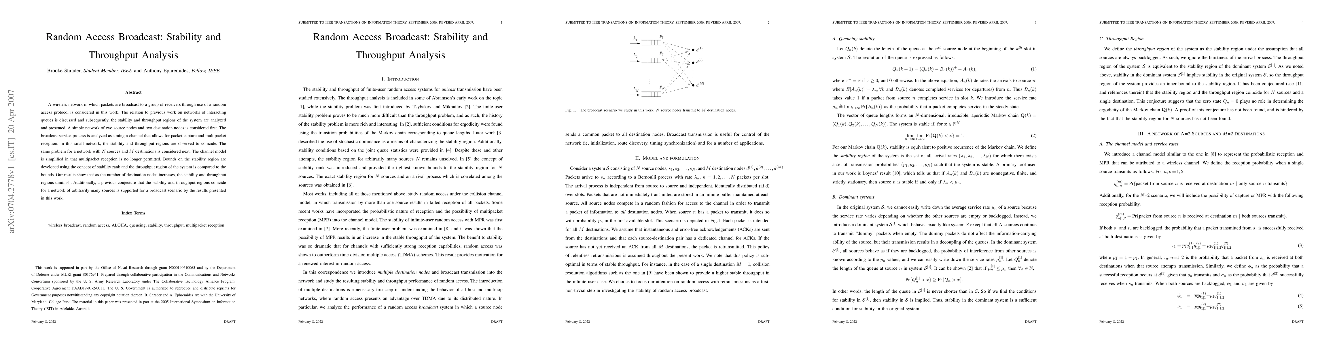 This paper analyzes the stability and throughput in random access broadcast wireless networks, showing that in small networks, stability and throughput regions coincide. For larger networks, it finds diminishing stability and throughput regions with increasing destination nodes, supporting the conjecture that these regions coincide in broadcast scenarios.