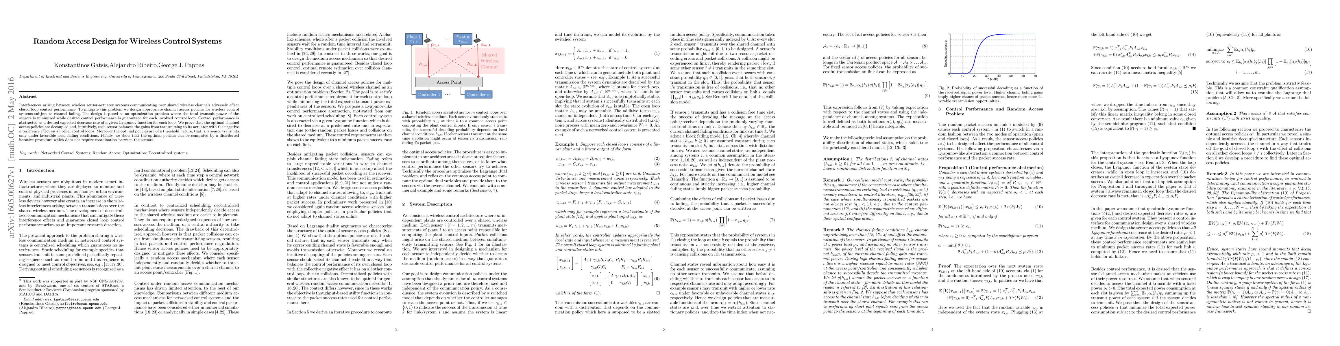 This paper proposes optimization-based channel access policies for wireless control systems to minimize interference and total transmit power while ensuring desired control performance. The optimal policies are decoupled and threshold-based, balancing local transmission benefits against interference, and can be computed via a distributed iterative method.
