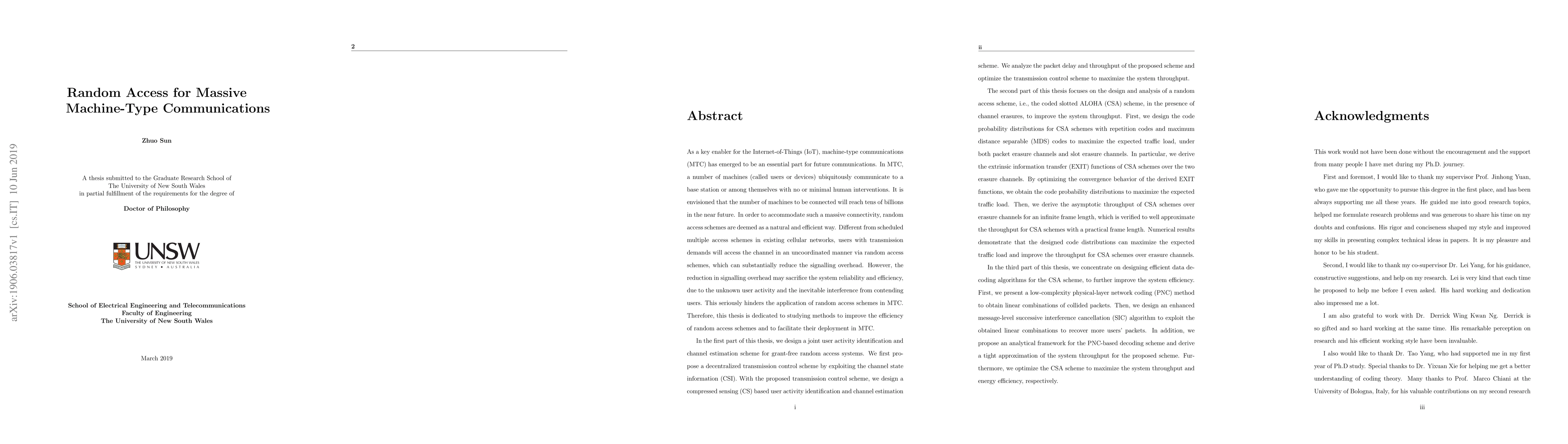 This paper explores methods to enhance the efficiency of random access schemes for massive machine-type communications (MTC). It proposes a decentralized transmission control, a compressed sensing-based user identification scheme, and a coded slotted ALOHA (CSA) scheme optimized for erasure channels, along with efficient data decoding algorithms to maximize system throughput and energy efficiency.