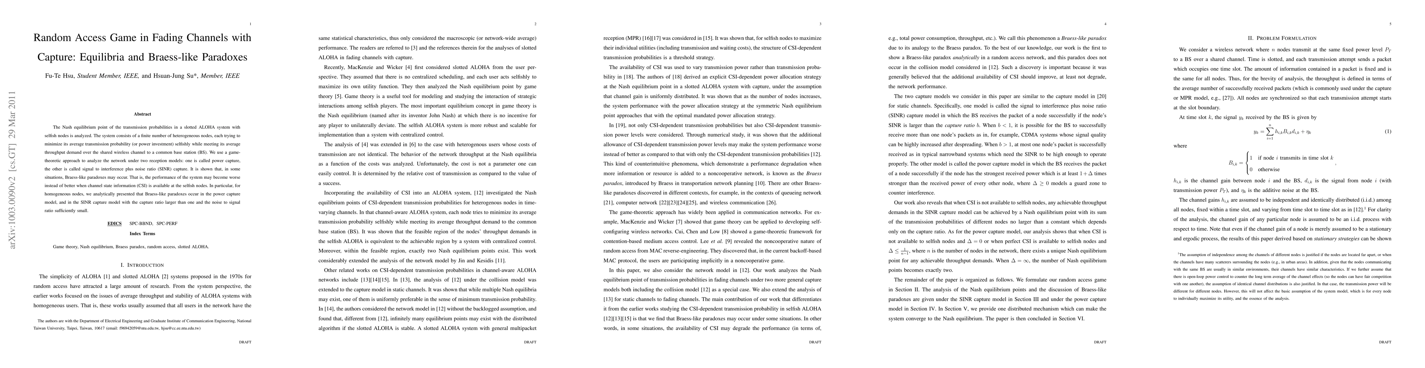 The Nash equilibrium point of the transmission probabilities in a slotted ALOHA system with selfish nodes is analyzed. The system consists of a finite number of heterogeneous nodes, each trying to minimize its average transmission probability (or power investment) selfishly while meeting its average throughput demand over the shared wireless channel to a common base station (BS). We use a game-theoretic approach to analyze the network under two reception models: one is called power capture, the other is called signal to interference plus noise ratio (SINR) capture. It is shown that, in some situations, Braess-like paradoxes may occur. That is, the performance of the system may become worse instead of better when channel state information (CSI) is available at the selfish nodes. In particular, for homogeneous nodes, we analytically present that Braess-like paradoxes occur in the power capture model, and in the SINR capture model with the capture ratio larger than one and the noise to signal ratio sufficiently small.
