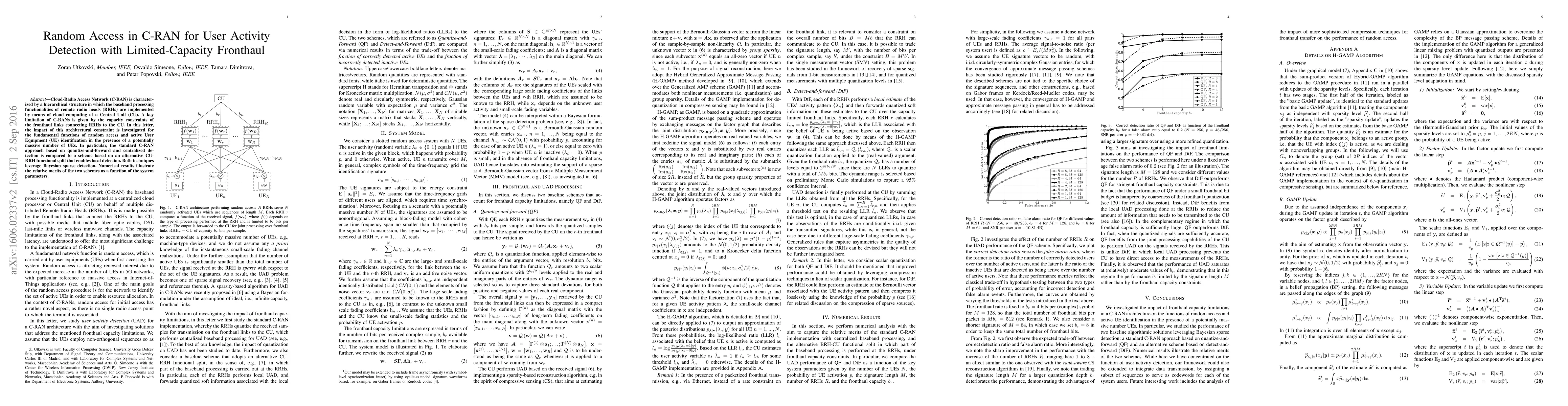 Cloud-Radio Access Network (C-RAN) is characterized by a hierarchical structure in which the baseband processing functionalities of remote radio heads (RRHs) are implemented by means of cloud computing at a Central Unit (CU). A key limitation of C-RANs is given by the capacity constraints of the fronthaul links connecting RRHs to the CU. In this letter, the impact of this architectural constraint is investigated for the fundamental functions of random access and active User Equipment (UE) identification in the presence of a potentially massive number of UEs. In particular, the standard C-RAN approach based on quantize-and-forward and centralized detection is compared to a scheme based on an alternative CU-RRH functional split that enables local detection. Both techniques leverage Bayesian sparse detection. Numerical results illustrate the relative merits of the two schemes as a function of the system parameters.