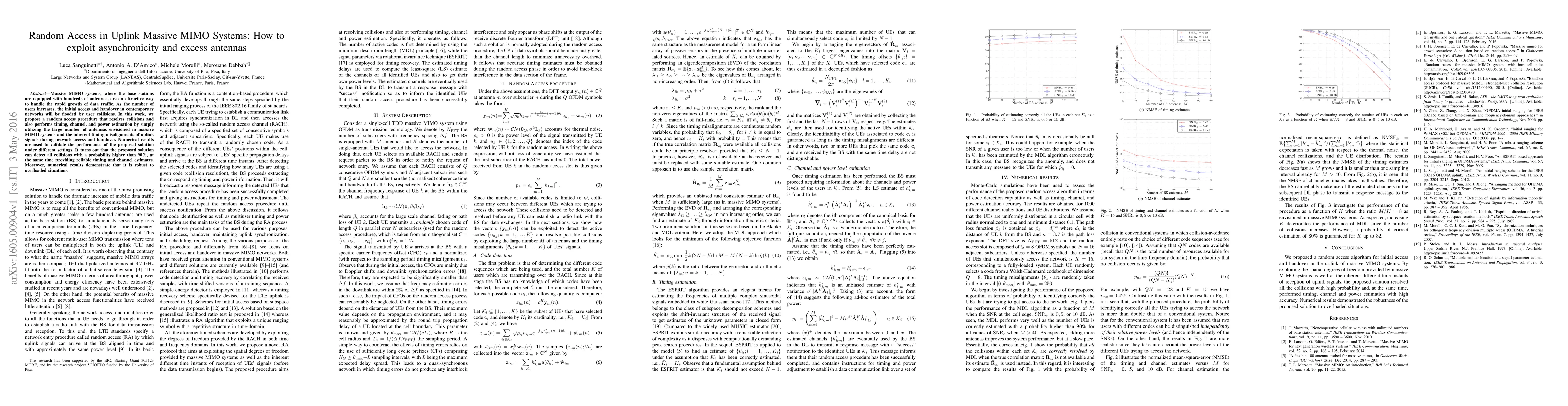 This paper proposes a random access procedure for uplink massive MIMO systems that leverages the large number of antennas and timing misalignments to resolve collisions, perform timing, channel, and power estimation. Numerical results show the method can detect collisions with over 90% probability and remains robust under overloaded conditions.