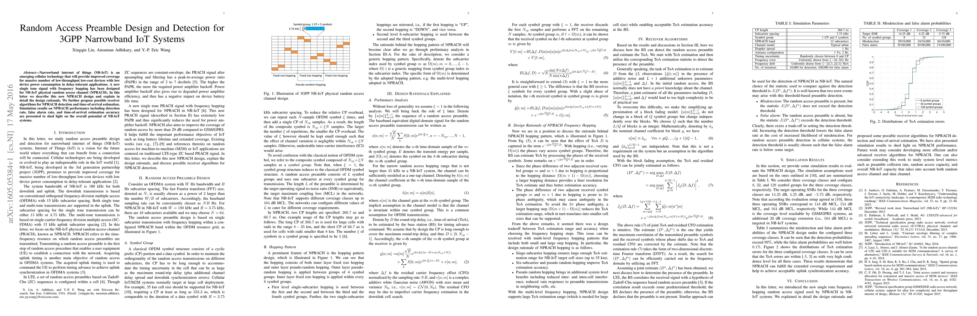 This paper introduces a novel single tone frequency hopping signal for the 3GPP Narrowband IoT (NB-IoT) physical random access channel (NPRACH), detailing its design rationale and proposing receiver algorithms for NPRACH detection and time-of-arrival estimation. Simulation results demonstrate the performance of NPRACH in terms of detection rate, false alarm rate, and time-of-arrival accuracy.