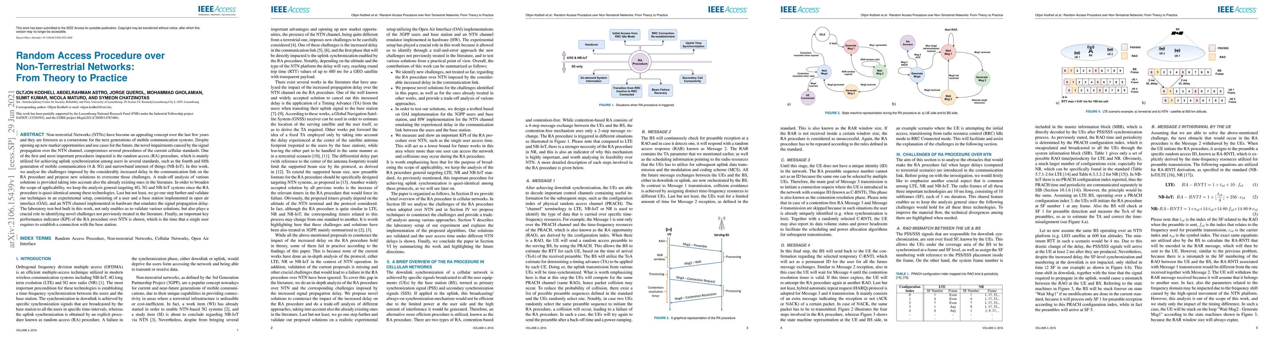 Non-terrestrial Networks (NTNs) have become an appealing concept over the last few years and they are foreseen as a cornerstone for the next generations of mobile communication systems. Despite opening up new market opportunities and use cases for the future, the novel impairments caused by the signal propagation over the NTN channel compromises several procedures of the current cellular standards. One of the first and most important procedures impacted is the random access (RA) procedure, which is mainly utilized for achieving uplink synchronization among users in several standards, such as the fourth and fifth generation of mobile communication (4 & 5G) and narrowband internet of things (NB-IoT). In this work, we analyse the challenges imposed by the considerably increased delay in the communication link on the RA procedure and propose new solutions to overcome those challenges. A trade-off analysis of various solutions is provided taking into account also the already existing ones in the literature. In order to broaden the scope of applicability, we keep the analysis general targeting 4G, 5G and NB-IoT systems since the RA procedure is quasi-identical among these technologies. Last but not least, we go one step further and validate our techniques in an experimental setup, consisting of a user and a base station implemented in open air interface (OAI), and an NTN channel implemented in hardware that emulates the signal propagation delay. The laboratory test-bed built in this work, not only enables us to validate various solutions, but also plays a crucial role in identifying novel challenges not previously treated in the literature. Finally, an important key performance indicator (KPI) of the RA procedure over NTN is shown, which is the time that a single user requires to establish a connection with the base station.