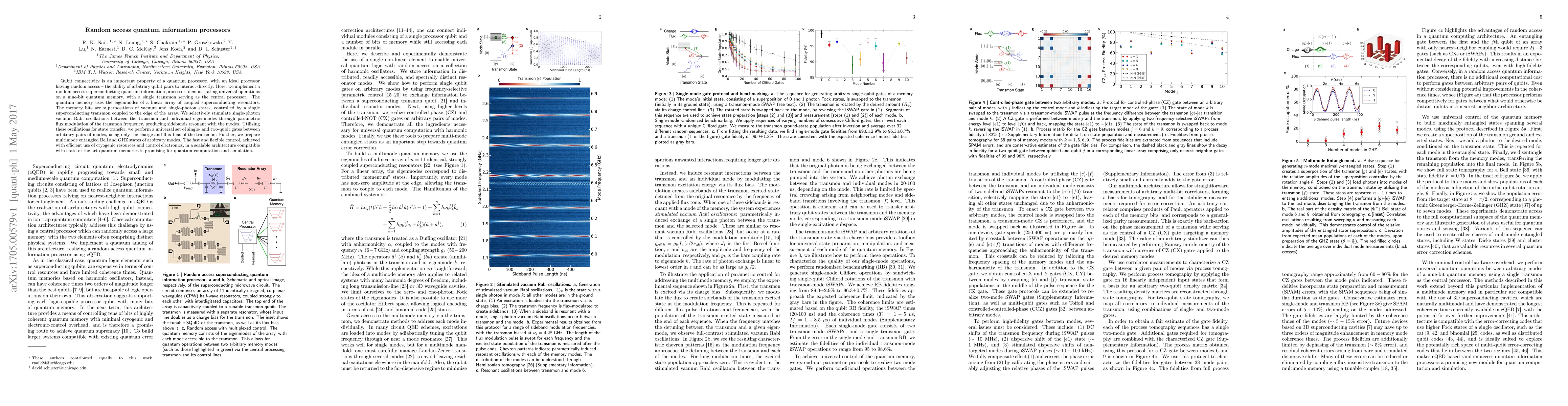 Qubit connectivity is an important property of a quantum processor, with an ideal processor having random access -- the ability of arbitrary qubit pairs to interact directly. Here, we implement a random access superconducting quantum information processor, demonstrating universal operations on a nine-bit quantum memory, with a single transmon serving as the central processor. The quantum memory uses the eigenmodes of a linear array of coupled superconducting resonators. The memory bits are superpositions of vacuum and single-photon states, controlled by a single superconducting transmon coupled to the edge of the array. We selectively stimulate single-photon vacuum Rabi oscillations between the transmon and individual eigenmodes through parametric flux modulation of the transmon frequency, producing sidebands resonant with the modes. Utilizing these oscillations for state transfer, we perform a universal set of single- and two-qubit gates between arbitrary pairs of modes, using only the charge and flux bias of the transmon. Further, we prepare multimode entangled Bell and GHZ states of arbitrary modes. The fast and flexible control, achieved with efficient use of cryogenic resources and control electronics, in a scalable architecture compatible with state-of-the-art quantum memories is promising for quantum computation and simulation.