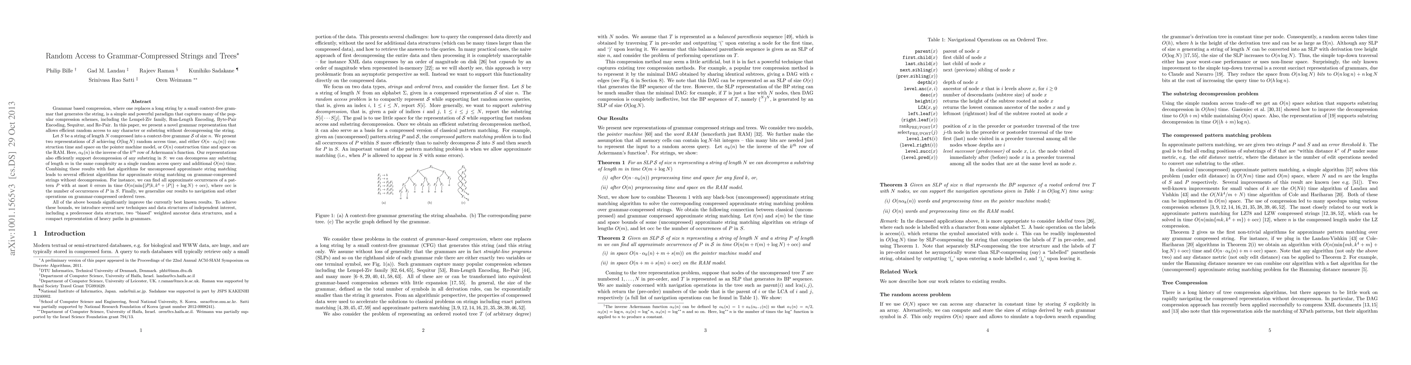Grammar based compression, where one replaces a long string by a small context-free grammar that generates the string, is a simple and powerful paradigm that captures many popular compression schemes. In this paper, we present a novel grammar representation that allows efficient random access to any character or substring without decompressing the string. Let $S$ be a string of length $N$ compressed into a context-free grammar $\mathcal{S}$ of size $n$. We present two representations of $\mathcal{S}$ achieving $O(\log N)$ random access time, and either $O(n\cdot \alpha_k(n))$ construction time and space on the pointer machine model, or $O(n)$ construction time and space on the RAM. Here, $\alpha_k(n)$ is the inverse of the $k^{th}$ row of Ackermann's function. Our representations also efficiently support decompression of any substring in $S$: we can decompress any substring of length $m$ in the same complexity as a single random access query and additional $O(m)$ time. Combining these results with fast algorithms for uncompressed approximate string matching leads to several efficient algorithms for approximate string matching on grammar-compressed strings without decompression. For instance, we can find all approximate occurrences of a pattern $P$ with at most $k$ errors in time $O(n(\min\{|P|k, k^4 + |P|\} + \log N) + occ)$, where $occ$ is the number of occurrences of $P$ in $S$. Finally, we generalize our results to navigation and other operations on grammar-compressed ordered trees. All of the above bounds significantly improve the currently best known results. To achieve these bounds, we introduce several new techniques and data structures of independent interest, including a predecessor data structure, two "biased" weighted ancestor data structures, and a compact representation of heavy paths in grammars.