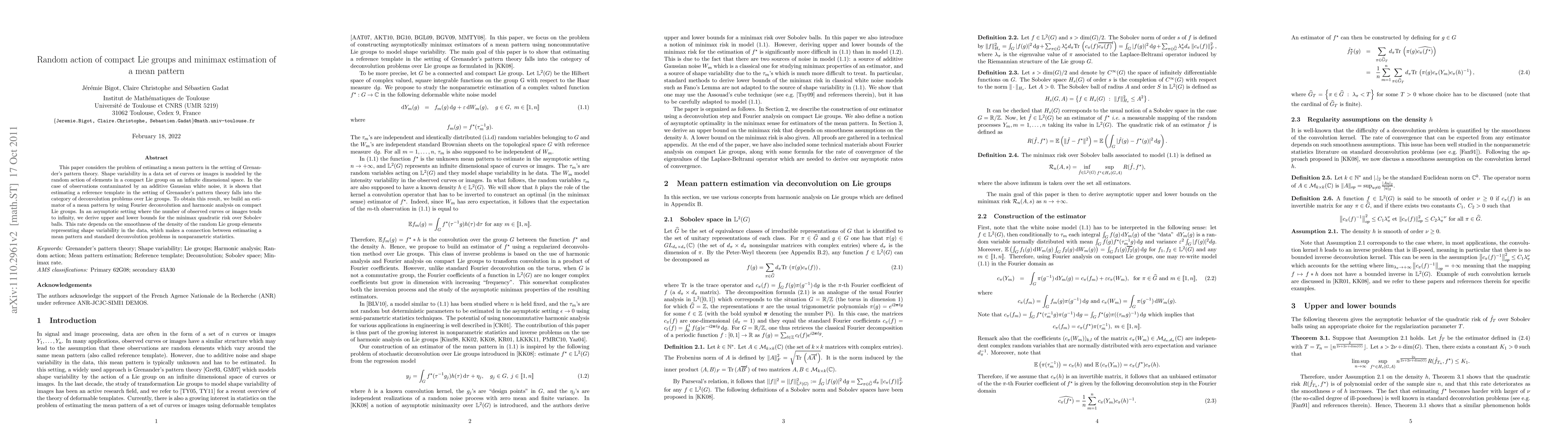 This paper addresses estimating mean patterns in shape variability using compact Lie groups' random actions. It models data variability and demonstrates that mean pattern estimation is a deconvolution problem over Lie groups, connecting it to standard nonparametric statistics' deconvolution. In an asymptotic setting, it derives minimax risk bounds for quadratic error, depending on the smoothness of random Lie group elements' density.