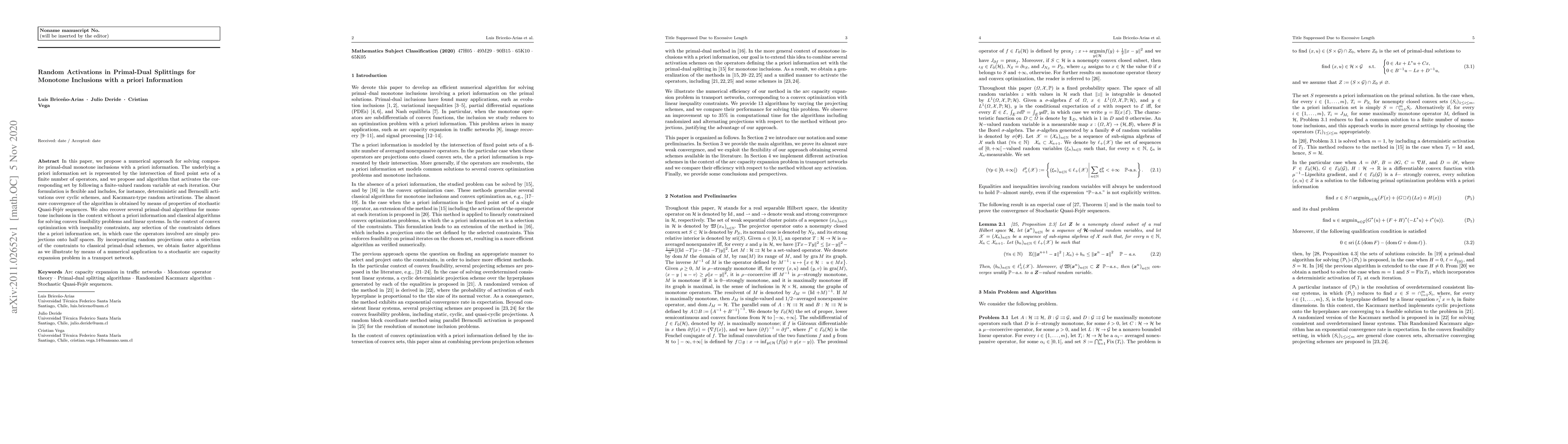 This paper proposes a novel numerical approach for solving composite primal-dual monotone inclusions using random activations based on a priori information. The algorithm leverages random variables to select operators, ensuring almost sure convergence through stochastic Quasi-Fejér sequences, and demonstrates faster convergence in applications like stochastic arc capacity expansion.