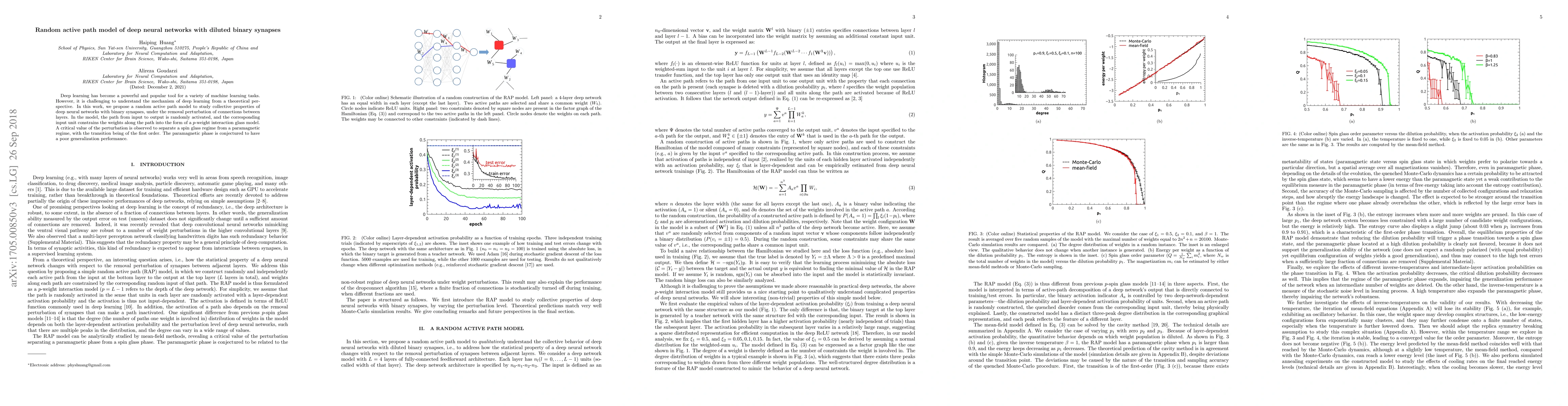Deep learning has become a powerful and popular tool for a variety of machine learning tasks. However, it is challenging to understand the mechanism of deep learning from a theoretical perspective. In this work, we propose a random active path model to study collective properties of deep neural networks with binary synapses, under the removal perturbation of connections between layers. In the model, the path from input to output is randomly activated, and the corresponding input unit constrains the weights along the path into the form of a $p$-weight interaction glass model. A critical value of the perturbation is observed to separate a spin glass regime from a paramagnetic regime, with the transition being of the first order. The paramagnetic phase is conjectured to have a poor generalization performance.
