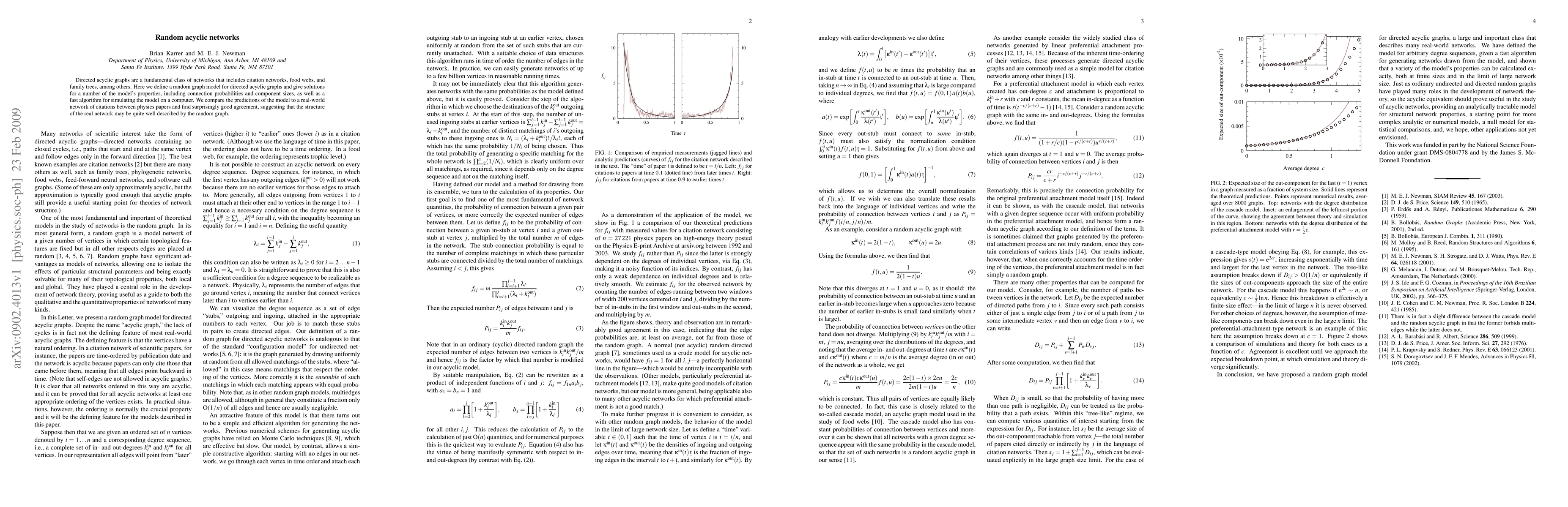 This paper introduces a random graph model for directed acyclic graphs (DAGs) and analyzes its properties, including connection probabilities and component sizes. The model's predictions are found to closely match those of a real-world citation network, indicating the model's potential to describe such structures.