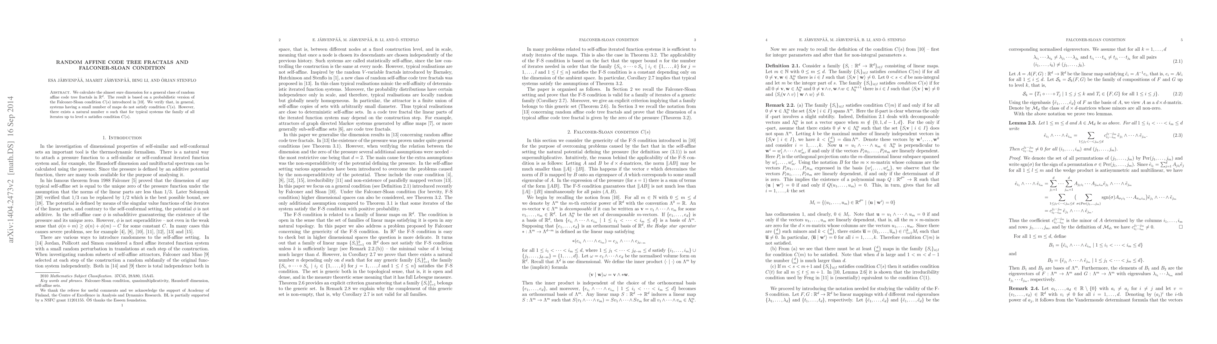We calculate the almost sure dimension for a general class of random affine code tree fractals in $\mathbb R^d$. The result is based on a probabilistic version of the Falconer-Sloan condition $C(s)$ introduced in \cite{FS}. We verify that, in general, systems having a small number of maps do not satisfy condition $C(s)$. However, there exists a natural number $n$ such that for typical systems the family of all iterates up to level $n$ satisfies condition $C(s)$.