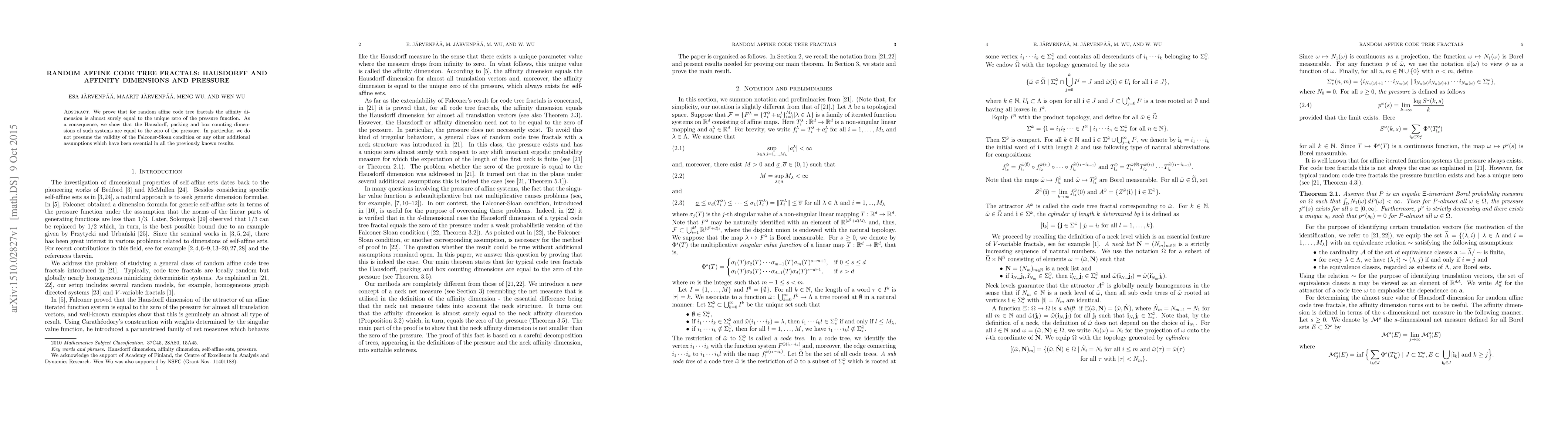 This paper demonstrates that for random affine code tree fractals, the affinity dimension is almost surely the unique zero of the pressure function, leading to the equality of Hausdorff, packing, and box counting dimensions at this zero. Notably, it does not require the Falconer-Sloan condition or other typical assumptions.