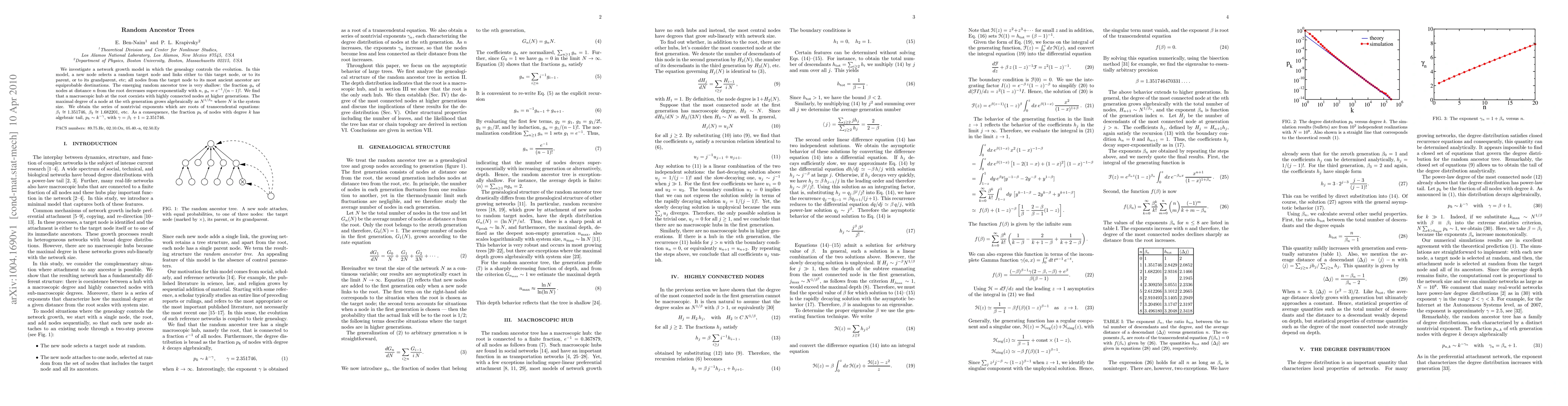 We investigate a network growth model in which the genealogy controls the evolution. In this model, a new node selects a random target node and links either to this target node, or to its parent, or to its grandparent, etc; all nodes from the target node to its most ancient ancestor are equiprobable destinations. The emerging random ancestor tree is very shallow: the fraction g_n of nodes at distance n from the root decreases super-exponentially with n, g_n=e^{-1}/(n-1)!. We find that a macroscopic hub at the root coexists with highly connected nodes at higher generations. The maximal degree of a node at the nth generation grows algebraically as N^{1/beta_n} where N is the system size. We obtain the series of nontrivial exponents which are roots of transcendental equations: beta_1= 1.351746, beta_2=1.682201, etc. As a consequence, the fraction p_k of nodes with degree k has algebraic tail, p_k ~ k^{-gamma}, with gamma=beta_1+1=2.351746.