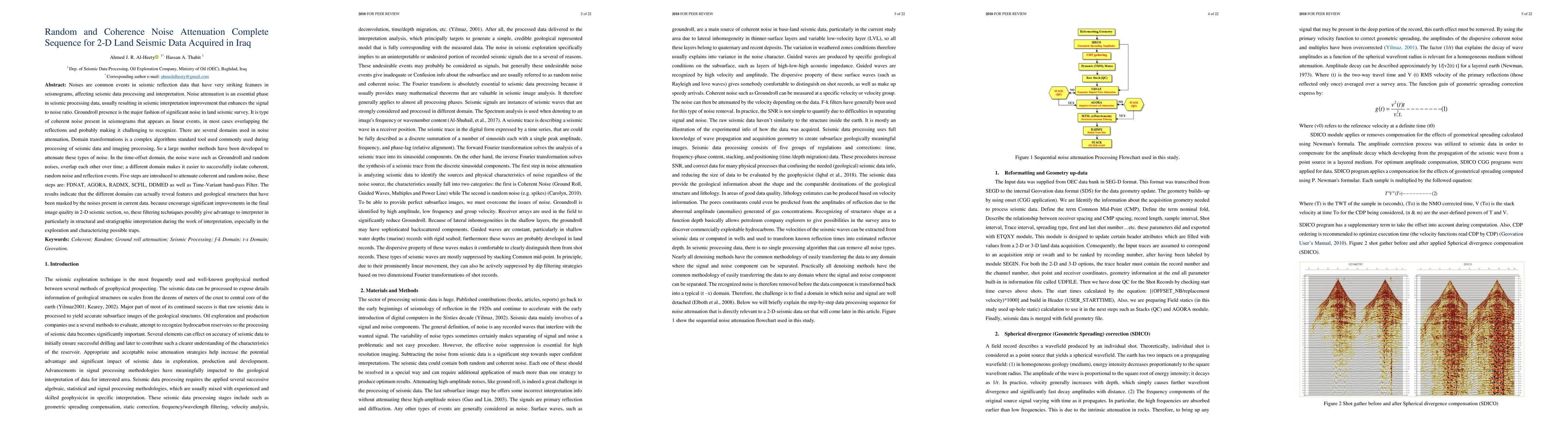 This paper introduces a five-step noise attenuation sequence (FDNAT, AGORA, RADMX, SCFIL, DDMED) for 2-D land seismic data in Iraq, focusing on coherent groundroll and random noise. The method enhances signal-to-noise ratio and reveals geological features, significantly improving 2-D seismic section interpretation for structural and stratigraphic analysis.