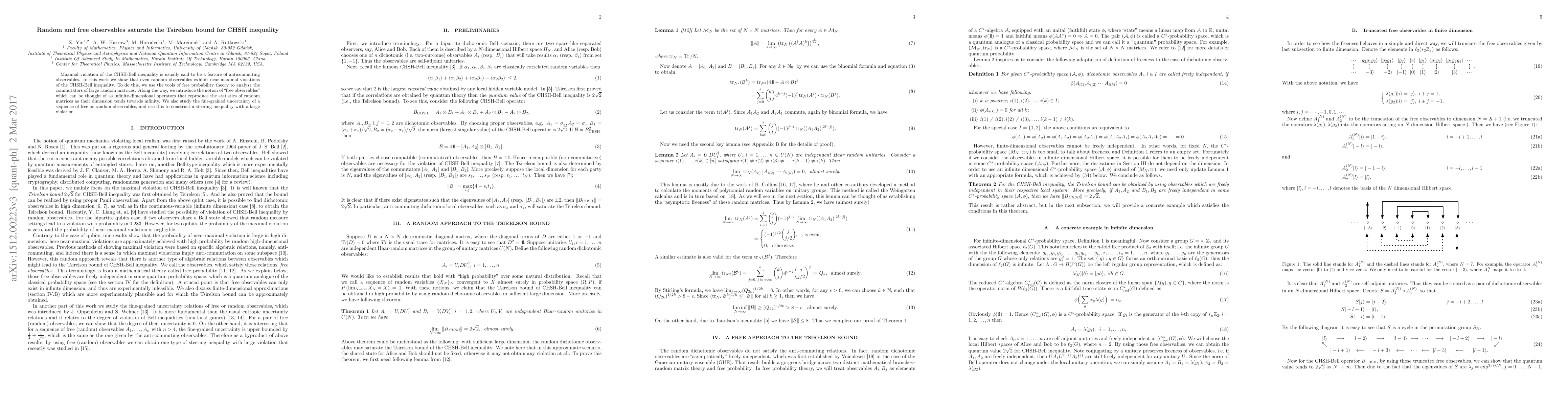 This paper demonstrates that random observables, when analyzed using free probability theory, can achieve near-maximal violations of the CHSH-Bell inequality traditionally associated with anticommuting observables. It introduces "free observables" as infinite-dimensional operators mirroring the statistics of large random matrices.