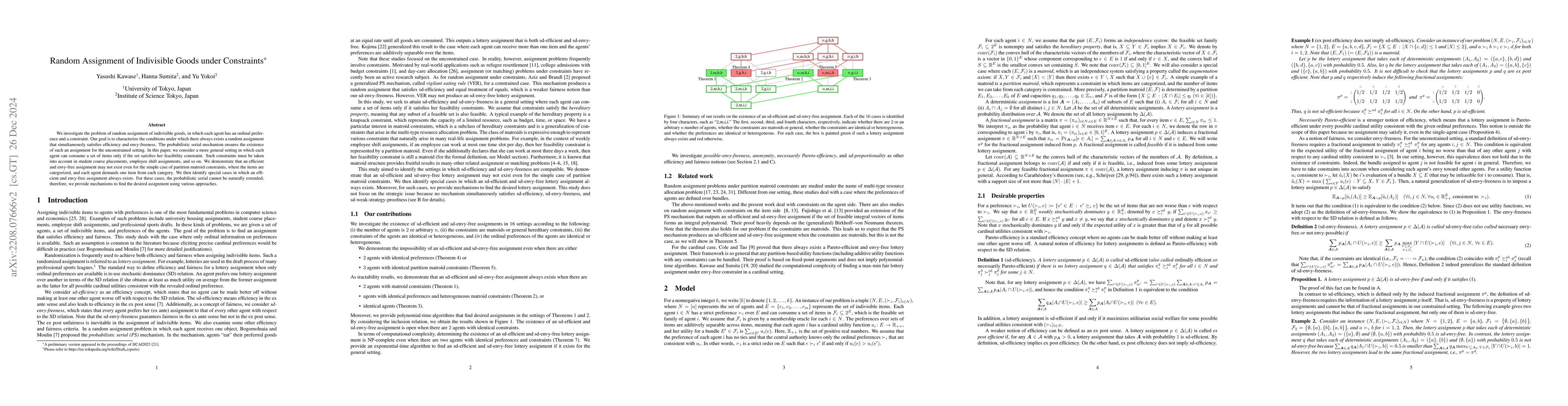 This paper explores the random assignment of indivisible goods under ordinal preferences and constraints, showing that efficient and envy-free assignments may not always exist, even with simple partition matroid constraints. It identifies special cases where such assignments are possible and proposes new mechanisms to achieve these conditions.