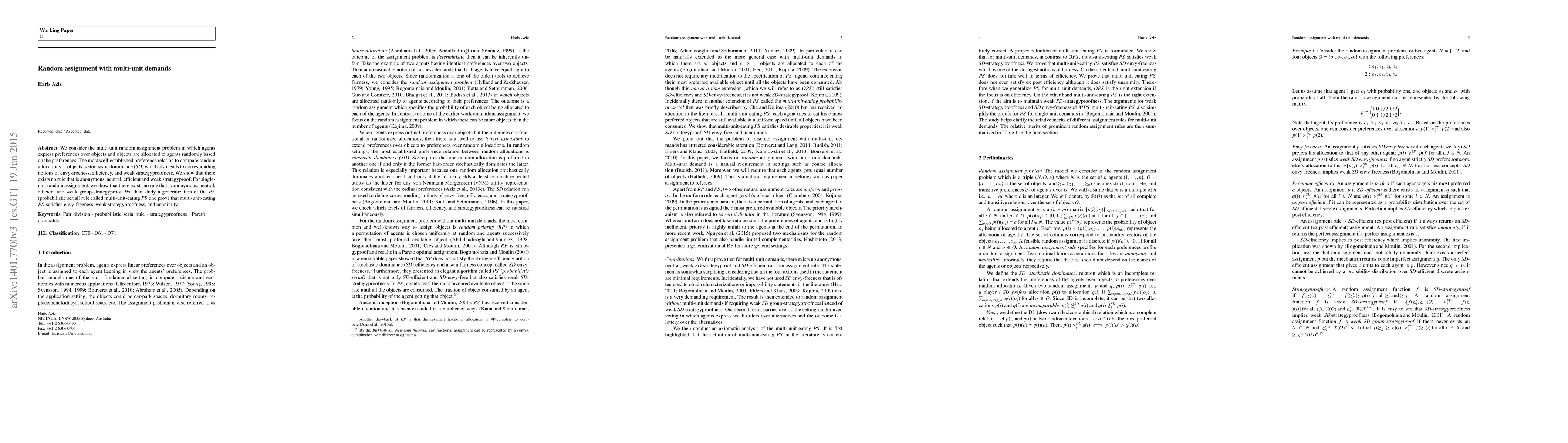 This paper explores the multi-unit random assignment problem where agents' preferences determine object allocations via random assignment. It demonstrates the impossibility of an anonymous, neutral, efficient, and weakly strategyproof rule for both multi-unit and single-unit scenarios. It introduces a generalized PS rule that satisfies envy-freeness, weak strategyproofness, and unanimity.