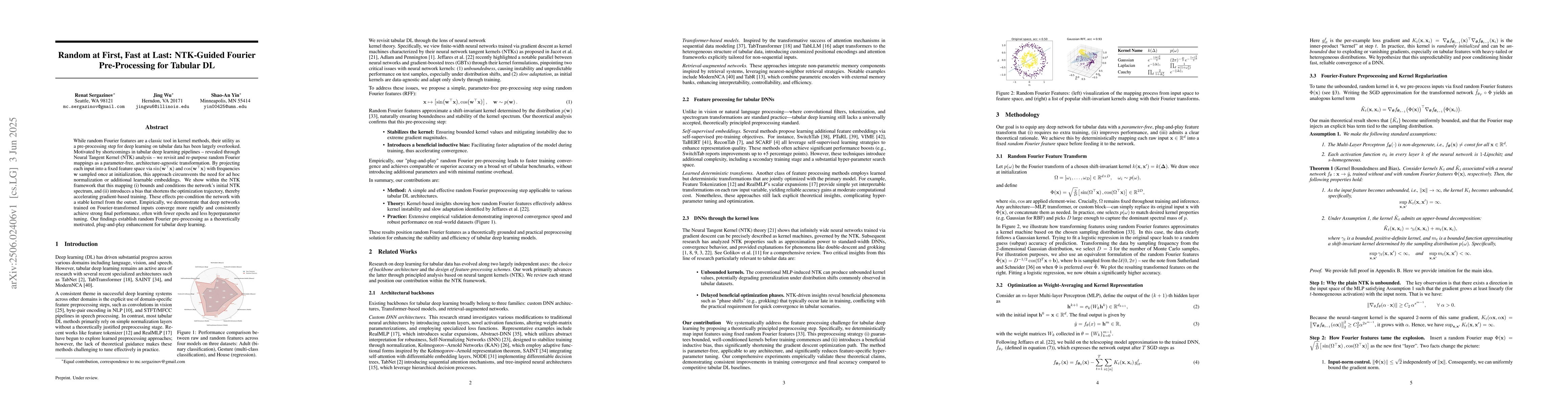 The research utilizes Neural Tangent Kernel (NTK) analysis to identify shortcomings in tabular deep learning pipelines and proposes random Fourier mappings as a solution, applied as a parameter-free, architecture-agnostic transformation via sine and cosine projections with fixed frequencies.