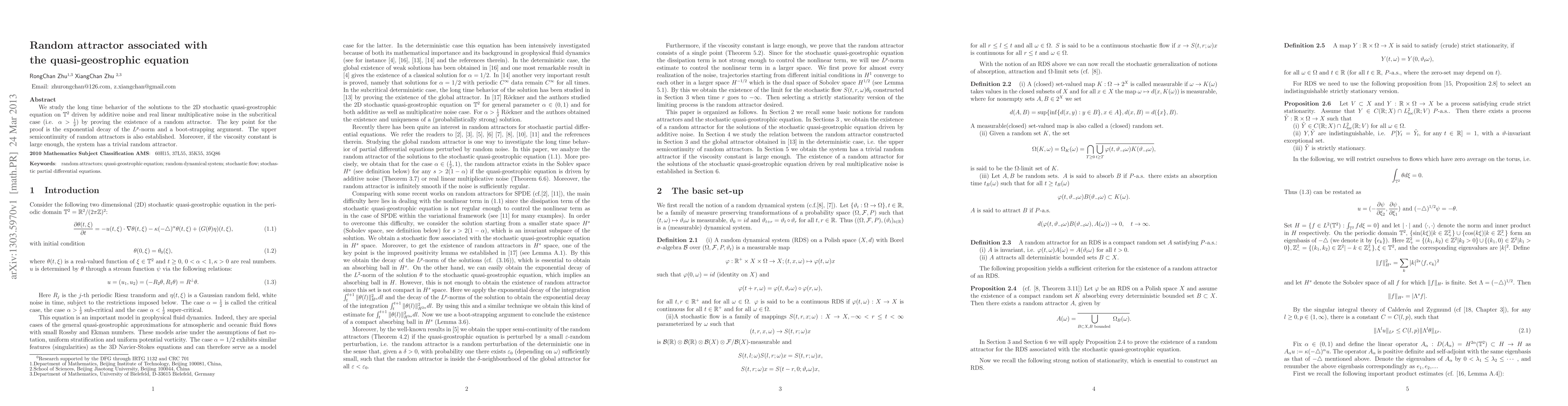 This paper investigates the long-term behavior of solutions to the 2D stochastic quasi-geostrophic equation, proving the existence of a random attractor through exponential decay of $L^p$-norm and a boot-strapping argument. It also establishes the upper semicontinuity of random attractors and shows that high viscosity leads to a trivial random attractor.