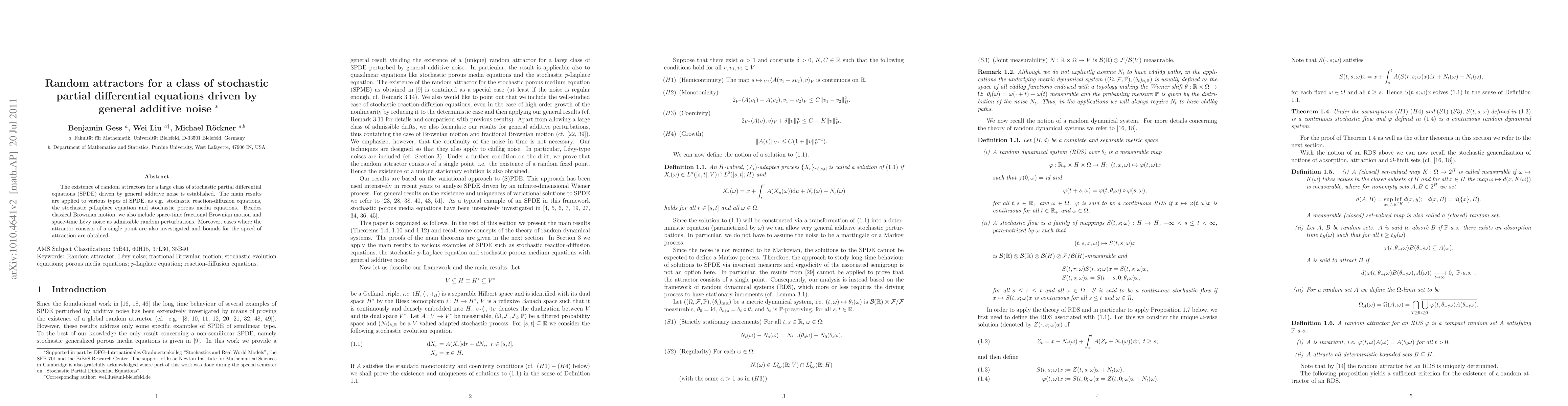 The existence of random attractors for a large class of stochastic partial differential equations (SPDE) driven by general additive noise is established. The main results are applied to various types of SPDE, as e.g. stochastic reaction-diffusion equations, the stochastic $p$-Laplace equation and stochastic porous media equations. Besides classical Brownian motion, we also include space-time fractional Brownian Motion and space-time L\'evy noise as admissible random perturbations. Moreover, cases where the attractor consists of a single point are considered and bounds for the speed of attraction are obtained.