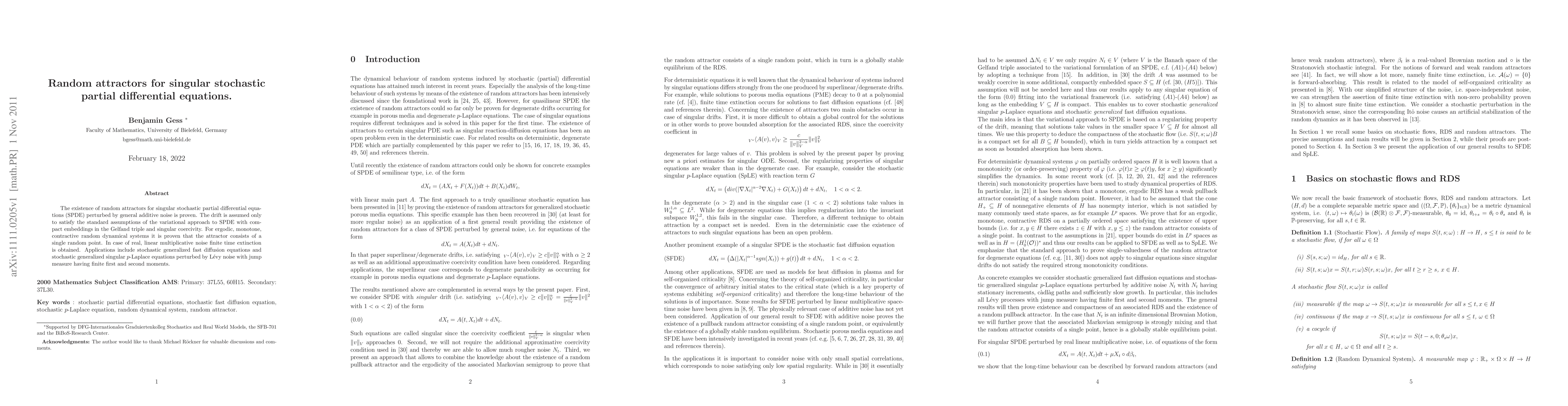 This paper proves the existence of random attractors for singular stochastic partial differential equations (SPDE) under general additive noise conditions. It demonstrates that the attractor is a single random point for ergodic, monotone, contractive systems, and shows finite time extinction for real, linear multiplicative noise. Applications cover stochastic generalized fast diffusion and singular p-Laplace equations with Lévy noise.