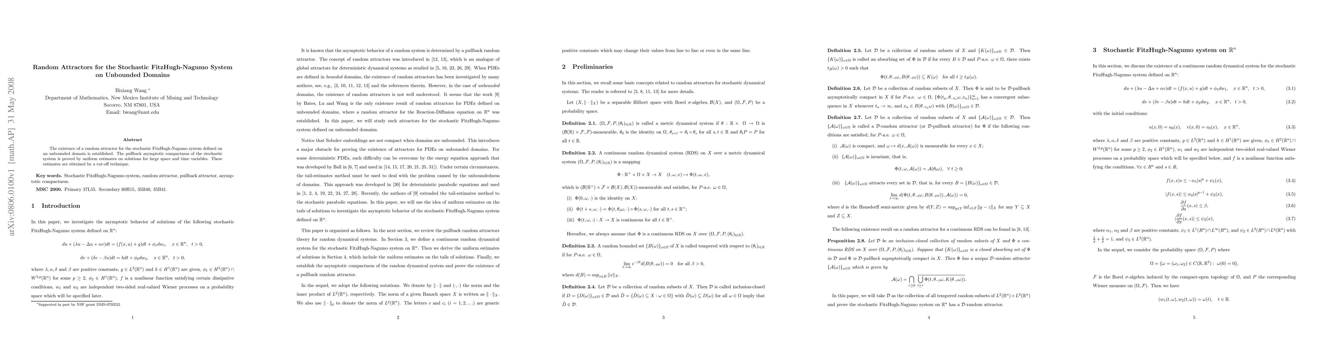 Summary: This paper establishes the existence of a random attractor for the stochastic FitzHugh-Nagumo system on unbounded domains, proving pullback asymptotic compactness through uniform estimates on solutions using a cut-off technique.