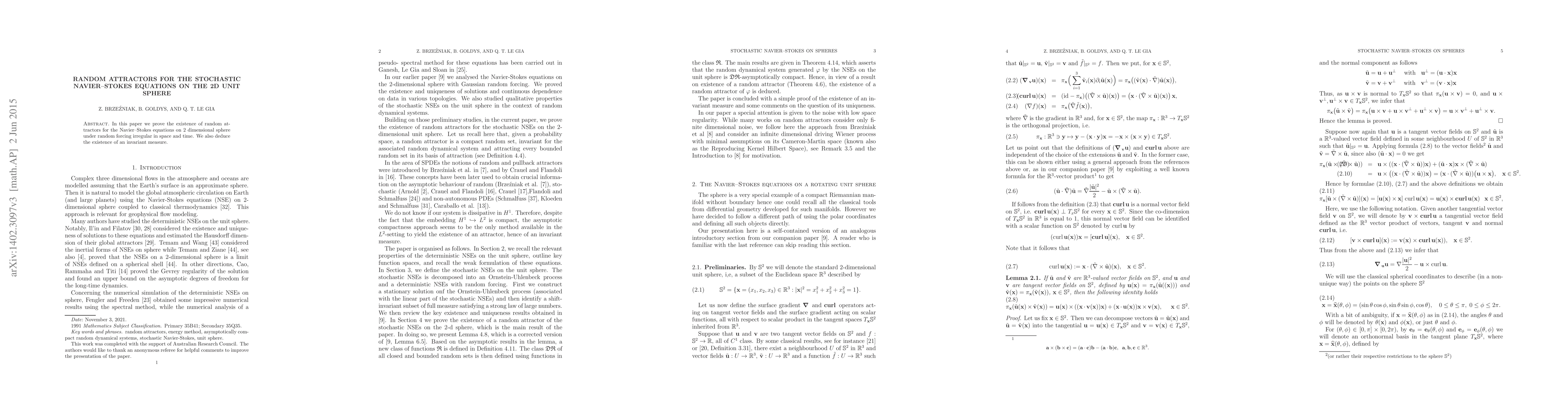 Summary: This paper establishes the existence of random attractors for stochastic Navier-Stokes equations on the 2D unit sphere under random, irregular forcing. Additionally, it demonstrates the existence of an invariant measure.