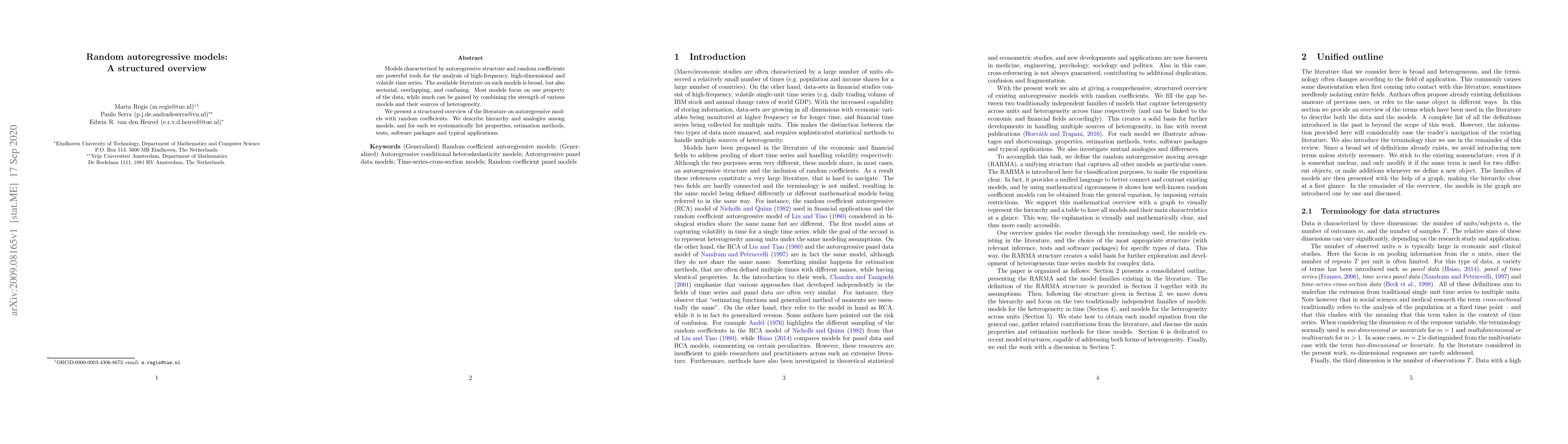 Models characterized by autoregressive structure and random coefficients are powerful tools for the analysis of high-frequency, high-dimensional and volatile time series. The available literature on such models is broad, but also sectorial, overlapping, and confusing. Most models focus on one property of the data, while much can be gained by combining the strength of various models and their sources of heterogeneity. We present a structured overview of the literature on autoregressive models with random coefficients. We describe hierarchy and analogies among models, and for each we systematically list properties, estimation methods, tests, software packages and typical applications.