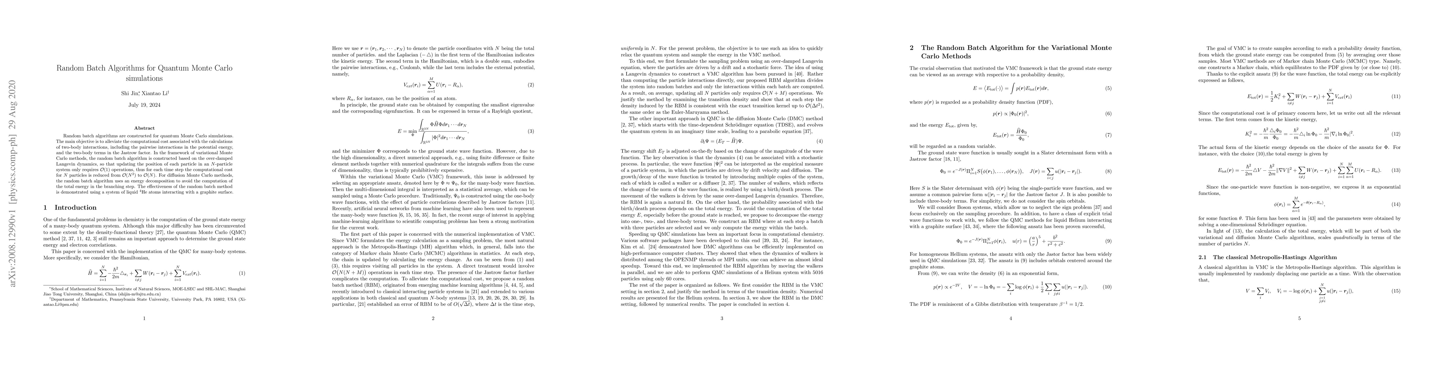 This paper introduces random batch algorithms for quantum Monte Carlo simulations to reduce computational costs for two-body interactions. It achieves $\mathcal{O}(N)$ operations per time step instead of $\mathcal{O}(N^2)$ by using over-damped Langevin dynamics for variational Monte Carlo and energy decomposition for diffusion Monte Carlo. The method's effectiveness is demonstrated on liquid ${}^4$He atoms near a graphite surface.