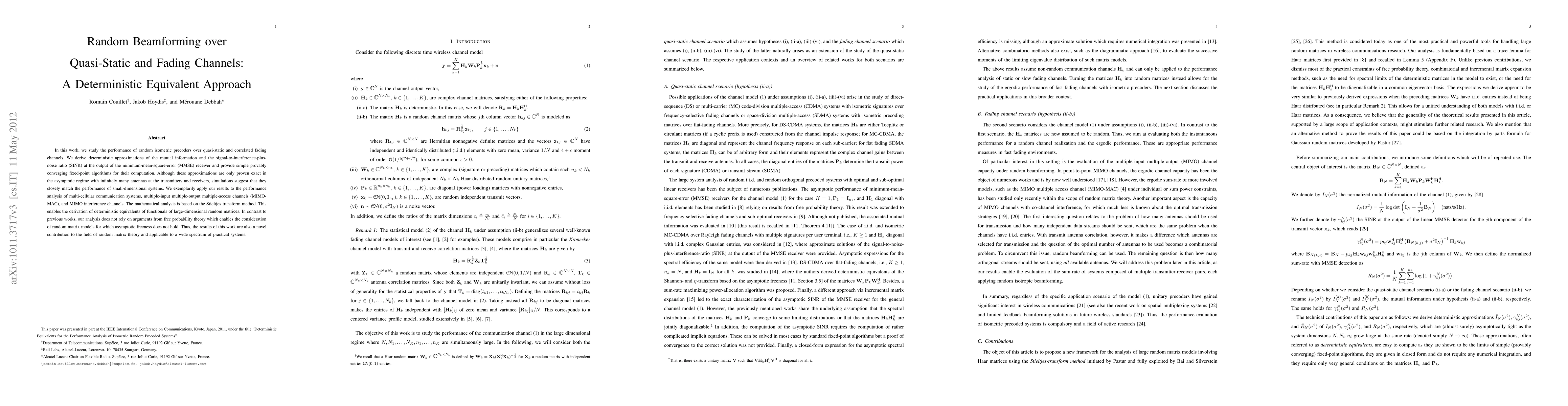 In this work, we study the performance of random isometric precoders over quasi-static and correlated fading channels. We derive deterministic approximations of the mutual information and the signal-to-interference-plus-noise ratio (SINR) at the output of the minimum-mean-square-error (MMSE) receiver and provide simple provably converging fixed-point algorithms for their computation. Although these approximations are only proven exact in the asymptotic regime with infinitely many antennas at the transmitters and receivers, simulations suggest that they closely match the performance of small-dimensional systems. We exemplarily apply our results to the performance analysis of multi-cellular communication systems, multiple-input multiple-output multiple-access channels (MIMO-MAC), and MIMO interference channels. The mathematical analysis is based on the Stieltjes transform method. This enables the derivation of deterministic equivalents of functionals of large-dimensional random matrices. In contrast to previous works, our analysis does not rely on arguments from free probability theory which enables the consideration of random matrix models for which asymptotic freeness does not hold. Thus, the results of this work are also a novel contribution to the field of random matrix theory and applicable to a wide spectrum of practical systems.
