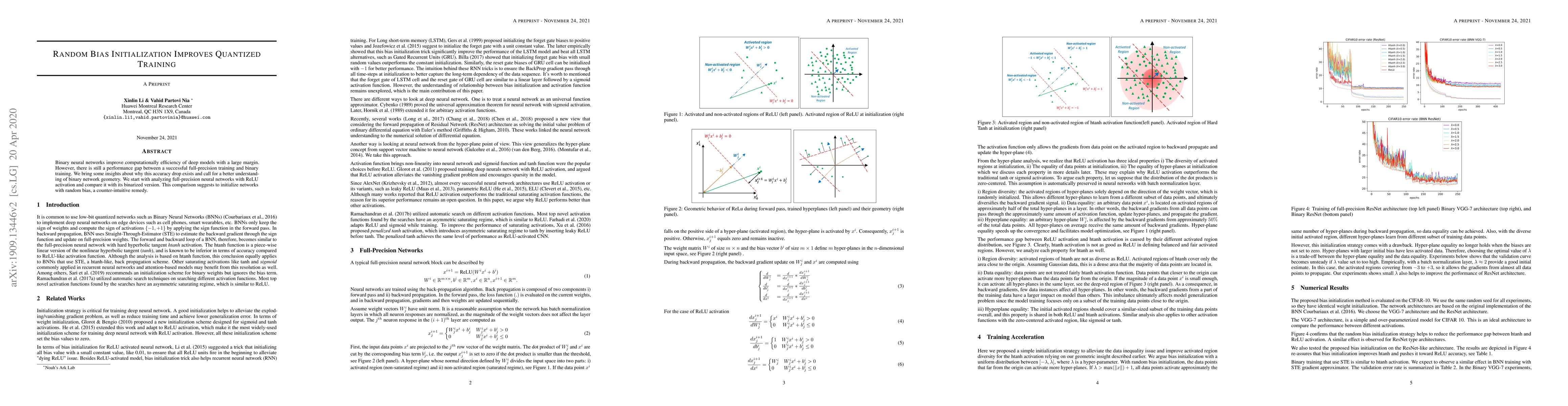Binary neural networks can improve deep model efficiency but still suffer from accuracy drops compared to full-precision training. Initializing networks with random bias improves performance.
